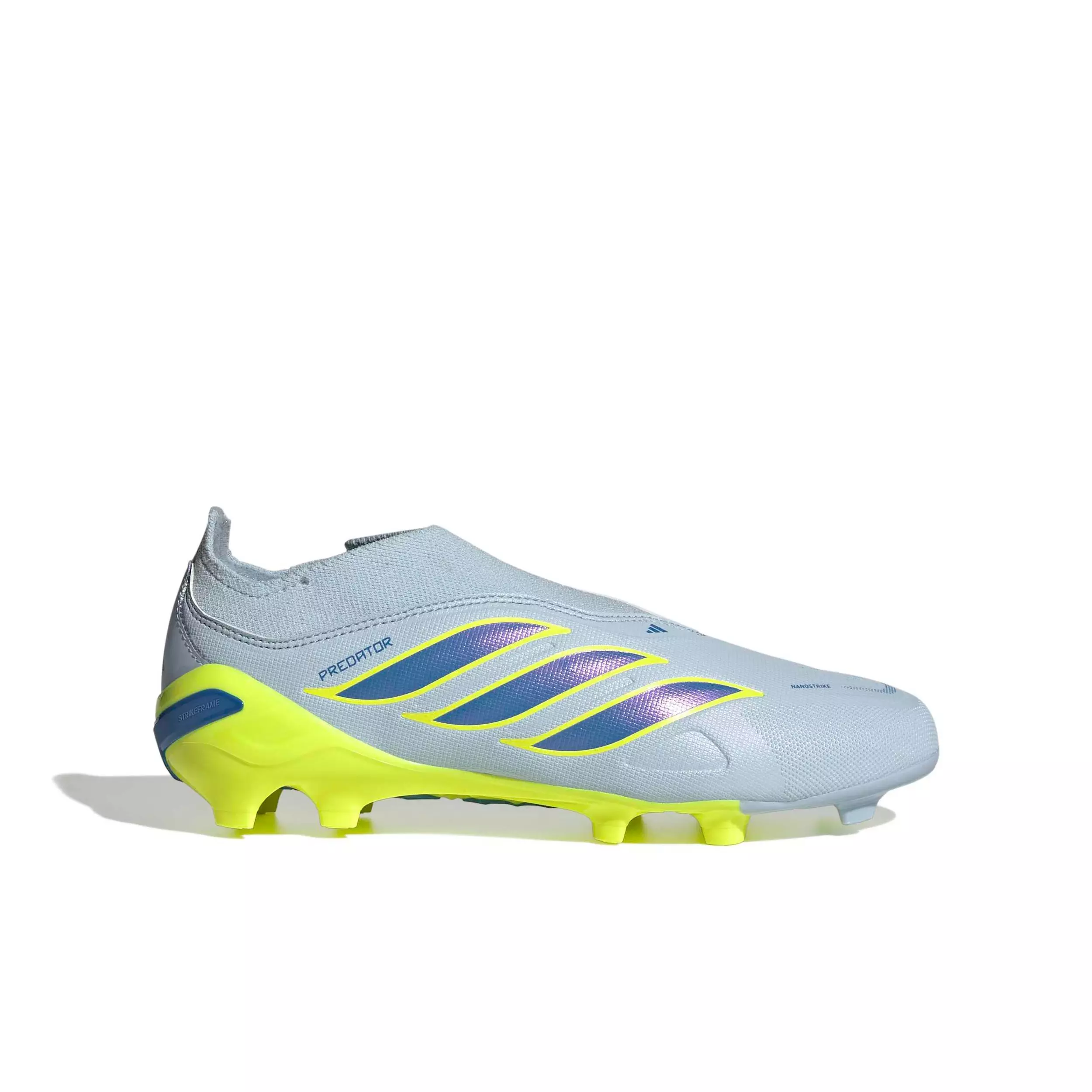 Watch them step onto the pitch with confidence in the adidas Predator League Laceless FG "Crystal Sky/Ray Blue/Team Solar Yellow 2" Preschool Kids' Soccer Cleat. Built to help young players unlock their potential, this footwear is all about performance. Made with synthetic and textile materials, these boots are engineered for firm ground surfaces, offering durability and comfort as they pass, dribble, and score. Designed to empower young athletes, they are crafted with our innovative mesh and striking technology, Nanostrike, to help them take control in front of the goal. Advanced PowerSpine technology, integrated into the new high-performance tooling, is built to deliver midfoot stability for strong shots, giving your child the edge they look for when striving for excellence. The StrikeFrame plate underfoot features a full-length lightweight construction that provides reliable traction for goal scoring. A laceless design offers a snug fit, allowing for seamless movement and precision as they find the net. These next-generation Predator boots are all about supporting their potential so they can give it their all with their team. Let your child unlock their goals with adidas, where heritage meets innovation.Features