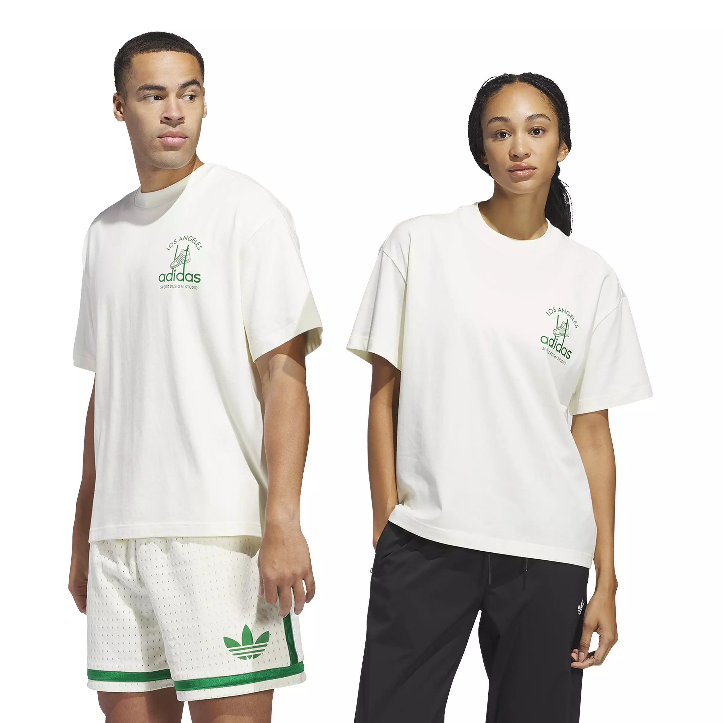 This adidas Unisex Adi Sport Design Studio Jabbar Graphic T-Shirt-White is for those who want to make a statement when they step onto the hardwood or just into a room. The oversized silhouette and bold design are a nod to the game-changing style of Kareem Abdul-Jabbar. Made from soft single jersey fabric, it lets you rep your love for the game in comfort.Features