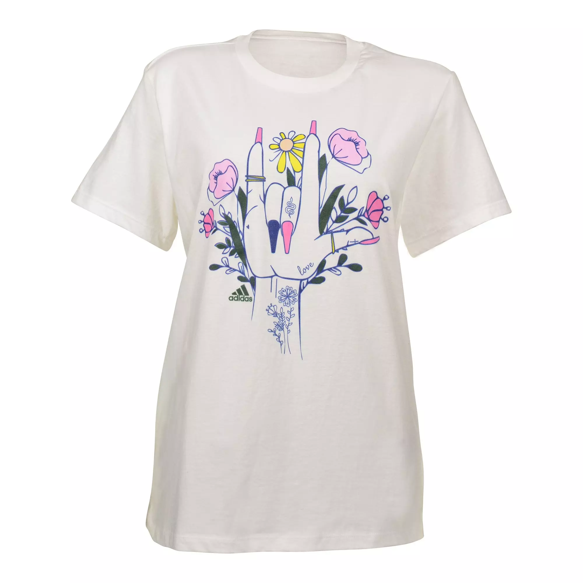 Floral blooms bring a fresh look to this adidas Women's Floral Graphic Tee. Soft cotton makes this an easygoing top for laid-back weekends and meetups with friends. Pair the vintage-inspired floral print with denim cutoffs or a flowing maxi skirt for effortless style. No matter where the day takes you, this lightweight tee lets you embrace the sunny season in comfort and style.