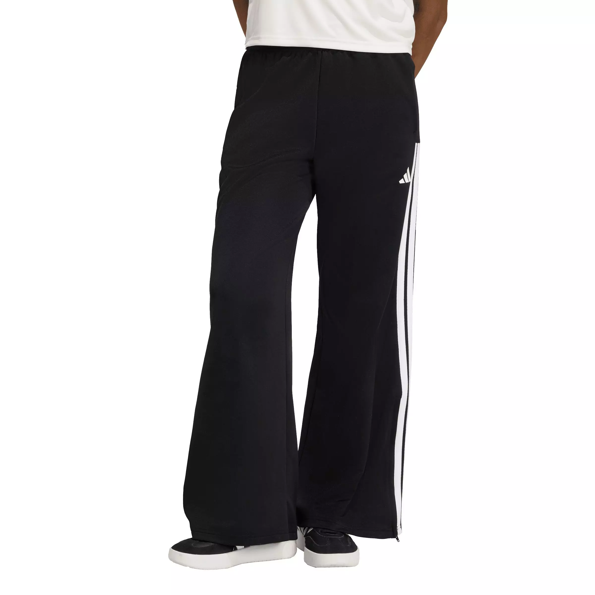 The adidas Women's House of Tiro Wide Leg Pants - Black are your go-to for effortless style and comfort. Featuring a bold 3-Stripes design, they add a touch of adidas heritage to your look. Designed in a loose fit, these trousers bring a relaxed vibe while helping you stay on-trend. The mid-rise waist and dropped-crotch design create a modern silhouette that complements favorite tops from your wardrobe. Crafted with a high-quality blend of cotton and polyester, these trousers are as comfortable as they are stylish. The elasticized waistband and inner drawcords provide comfortable hold, allowing you to move freely through your day. The classic 3-Stripes and a 3 Bar Logo on the left leg make a bold statement, while zips at the bottom of the legs offer versatility in styling. Welt pockets on both sides allow you to keep your essentials close at hand. Whether you're heading out for a casual day or dressing up for a night out, these pants are your go-to companion. Embrace the spirit of rebellious optimism and express yourself with confidence.Features