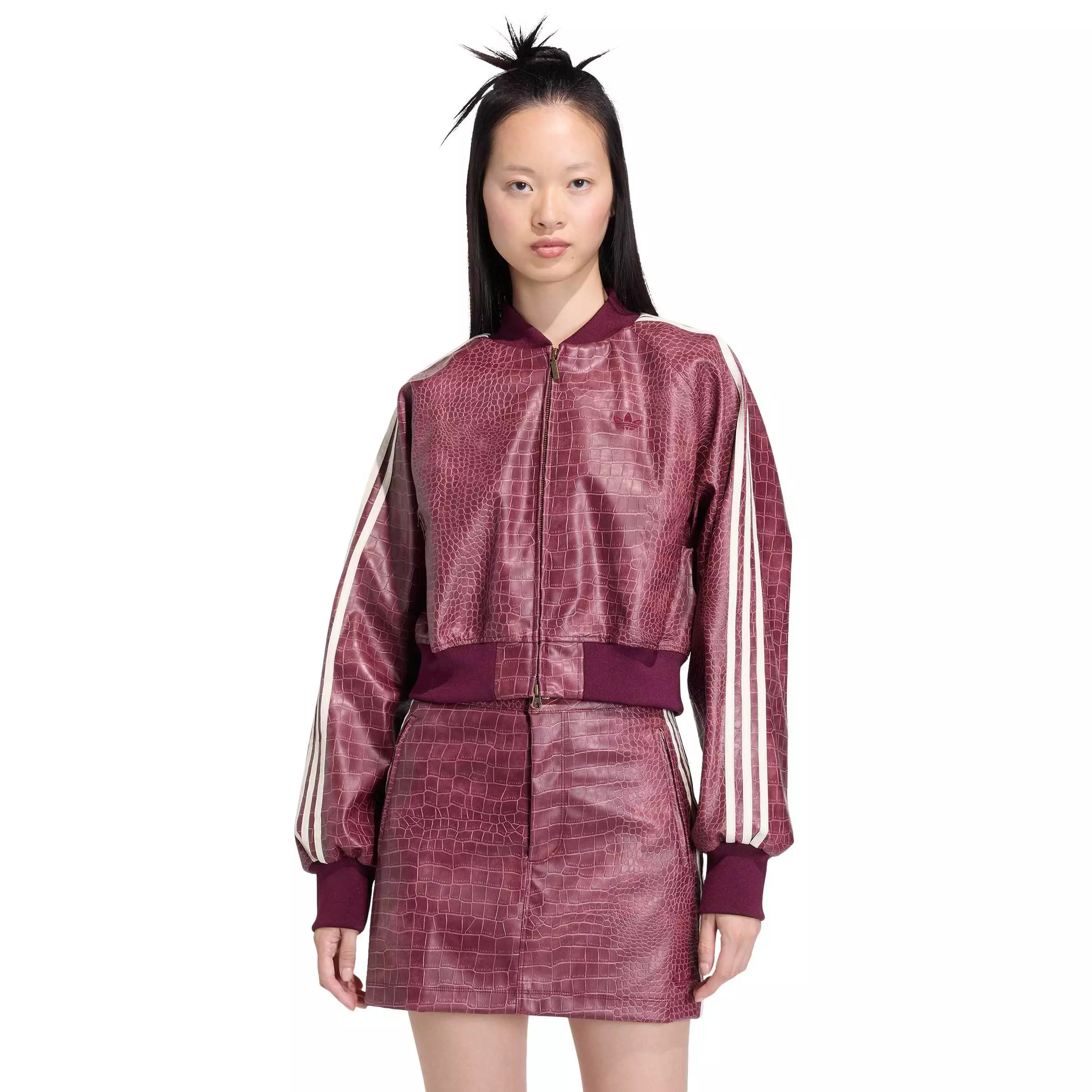 Crafted from imitation leather, this adidas Women's Pleather Jacket - Maroon brings a bold aesthetic designed to stand out in any crowd. Its baggy fit means it layers easily over your favorite outfits, making it a versatile addition to your wardrobe. The full-zip closure allows for easy wear and quick removal. Those two zip pockets are a great place to stash your phone and keys. Whether you're heading out for a casual day or a night out, this adidas jacket is your go-to for a stylish and confident look.Features