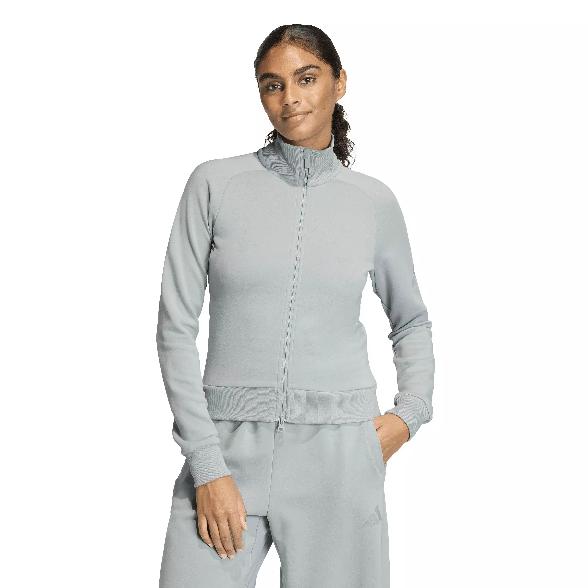 Sportswear gets a sophisticated spin with the adidas Women's Soft Lux Slim Track Top - Sage Green. Made with a peached spacer fabric for a luxe feel and elegant aesthetic, this tracksuit top can be adapted to suit a range of sporting and social occasions. With clean lines and a close-fitting silhouette, it can be teamed with leisurewear for a chic sporty look or styled with wardrobe favorites for a more dressed-up feel. The stand-up rib collar adds a smart edge, while the two-way zip offers versatile styling options. Tonal branding and high-density print details add subtle, refined touches, reflecting adidas’ attention to quality. Suitable for training sessions, casual outings, or layered styling, this tracksuit top combines comfort and style in a practical, contemporary design.Features