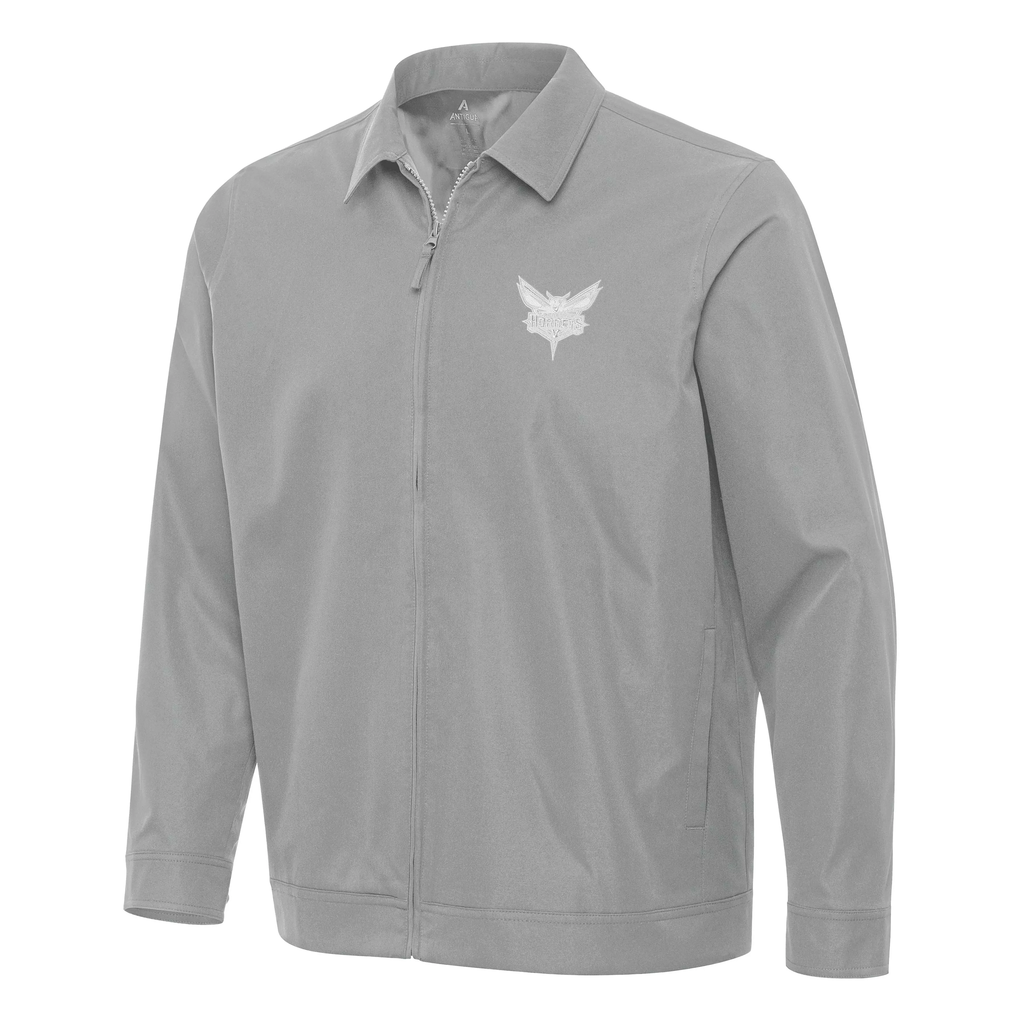 The Antigua Men's Charlotte Hornets Pivot Jacket-Light Grey will make you rethink your traditional workwear piece. This contemporary jacket features a self-fabric collar that lays flat and buttons at the cuff. Notice the constructed waistband that creates a polished silhouette that flatters both khakis and denim. A fully lined interior adds light insulation. You'll love this fresh take on a functional styleFeatures
