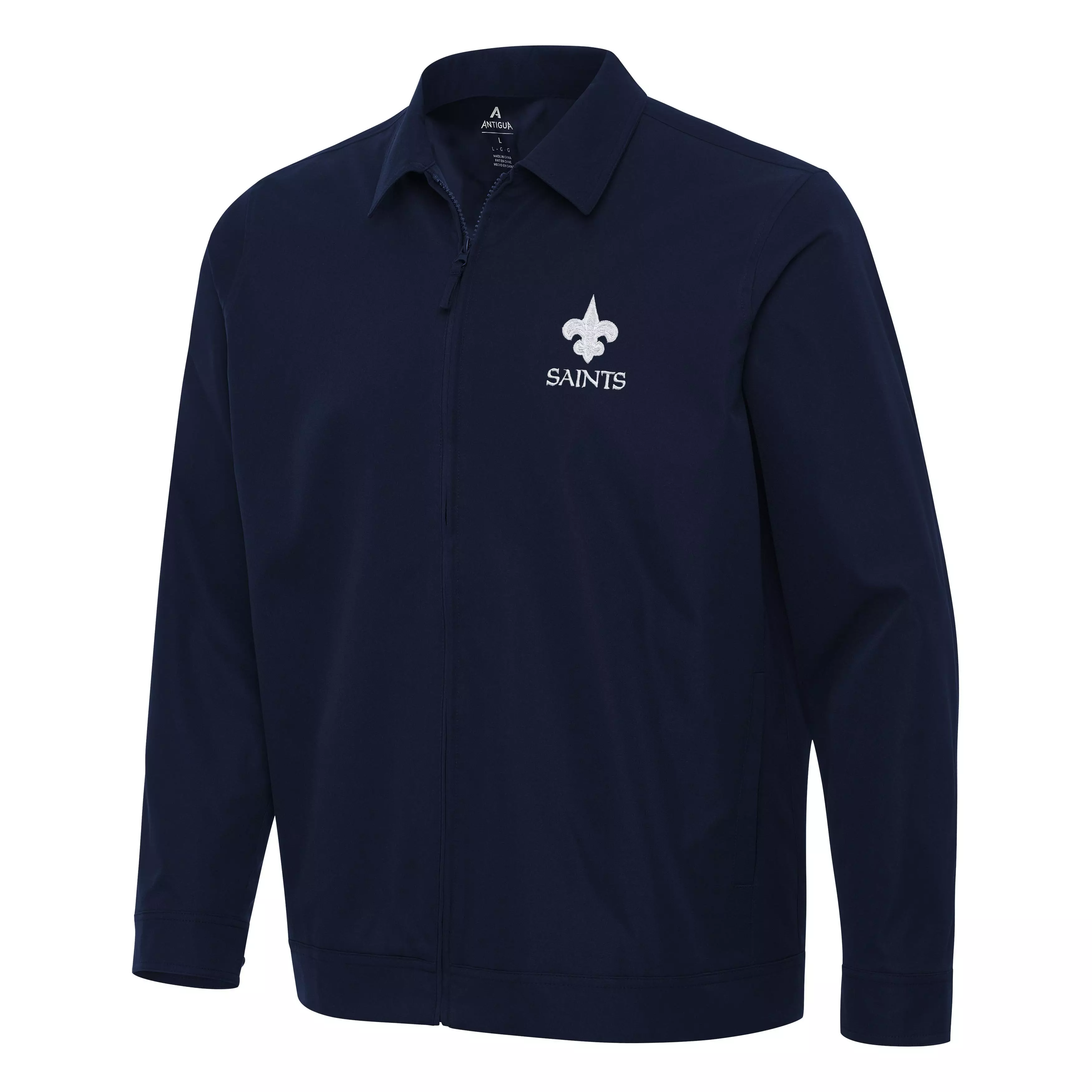 The Antigua Men's New Orleans Saints Pivot Jacket-Navy will make you rethink your traditional workwear piece. This contemporary jacket features a self-fabric collar that lays flat and buttons at the cuff. Notice the constructed waistband that creates a polished silhouette that flatters both khakis and denim. A fully lined interior adds light insulation. You'll love this fresh take on a functional styleFeatures