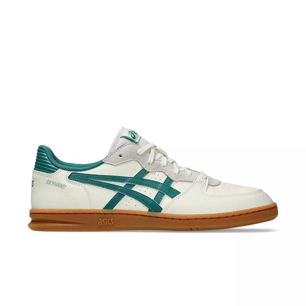 The ASICS Skyhand OG "Cream/Green" Unisex Shoe celebrates original handball heritage with 1990s design DNA. The slimmer-cut court silhouette combines revamped construction and modern comfort features while maintaining retro-inspired style.
