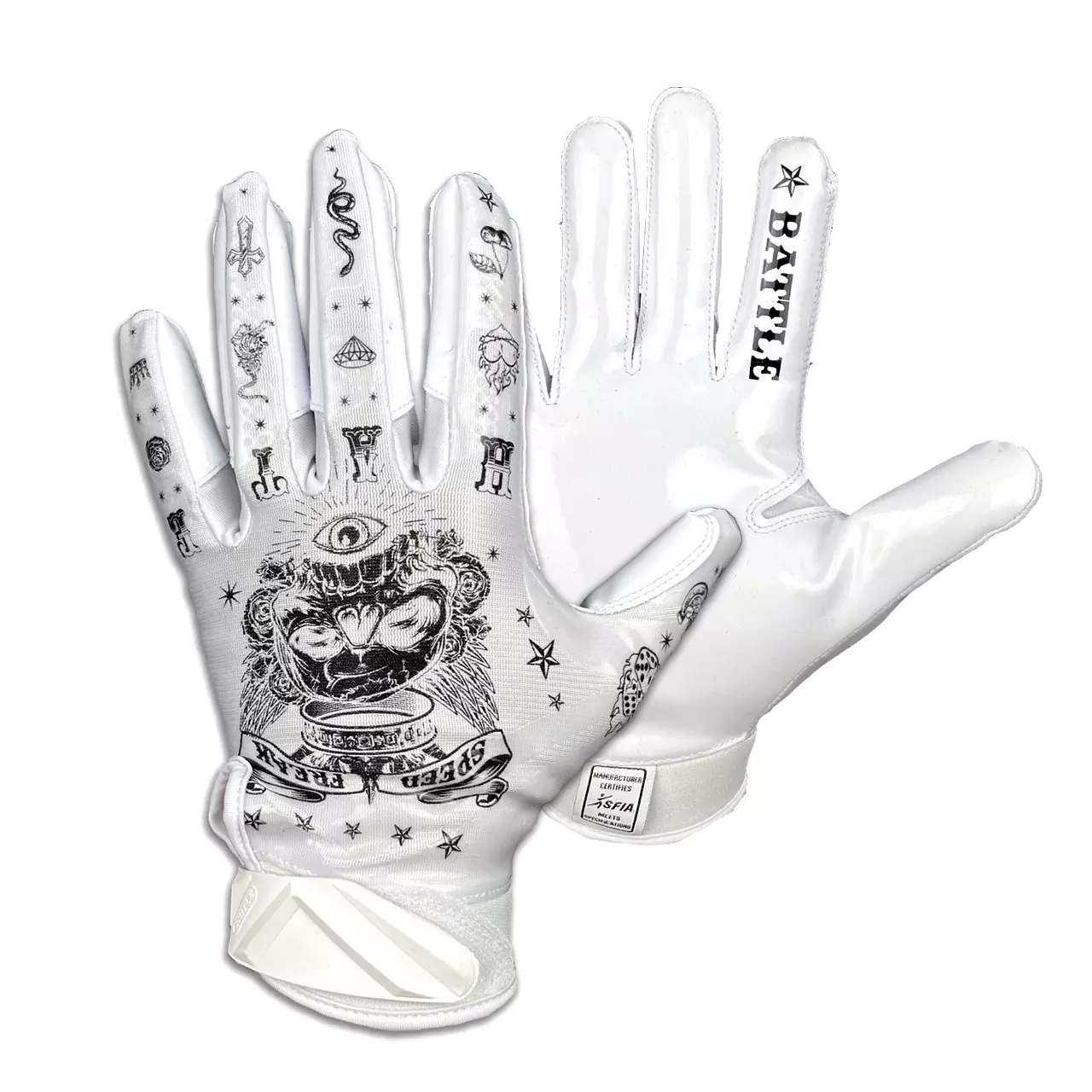 Battle Sports Speed Freak Football Receiver Gloves push limits with reinforced stitching and wear points. PerfectFit breathable material vents sweat during intense plays. Ultra-Stick palm delivers maximum grip at the legal stick limit. Durable panels extend lifespan on every catch.