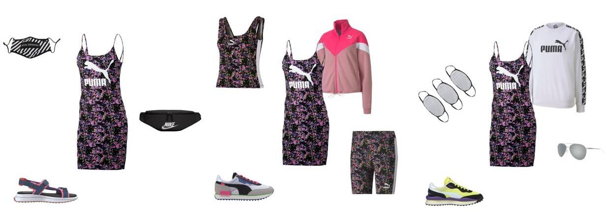 Outfit one keeps things clean by pairing the dress with pink and purple PUMA Future Rider Game On Unisex Sandals. A perfect spring or summer style, we’ve chosen to keep our accessories to a minimum, opting for a plain black waistpack and monochromatic fashion face mask.