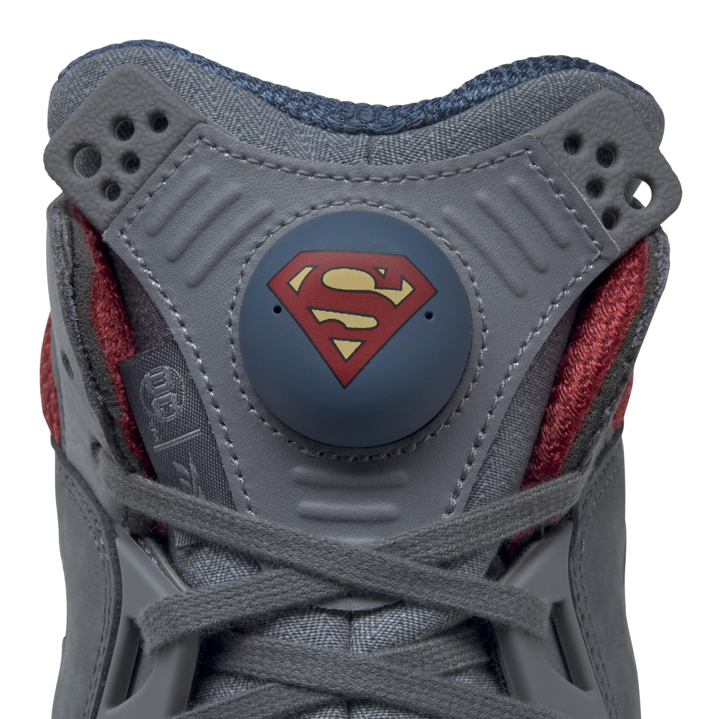 Beneath this, on the back of the heel, are some embroidered logos. You’ll see SHAQ in red on the right shoe, but on the left, there’s The Man of Steel imagery. This isn’t the only spot that pays tribute to our favorite kryptonite-fearing hero. There’s also a large Superman⢠emblem on the tongue pump, complete with a DC tongue tag just beneath.