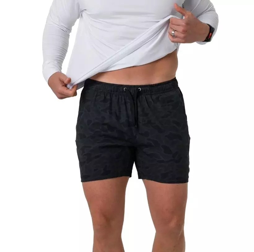 Burlebo Men's Athletic Shorts - Black Camo deliver performance and comfort during intense workouts and active days. Built-in compression liner adds support and comfort. Blended 90% polyester and 10% spandex yields lightweight, moisture-wicking wear.