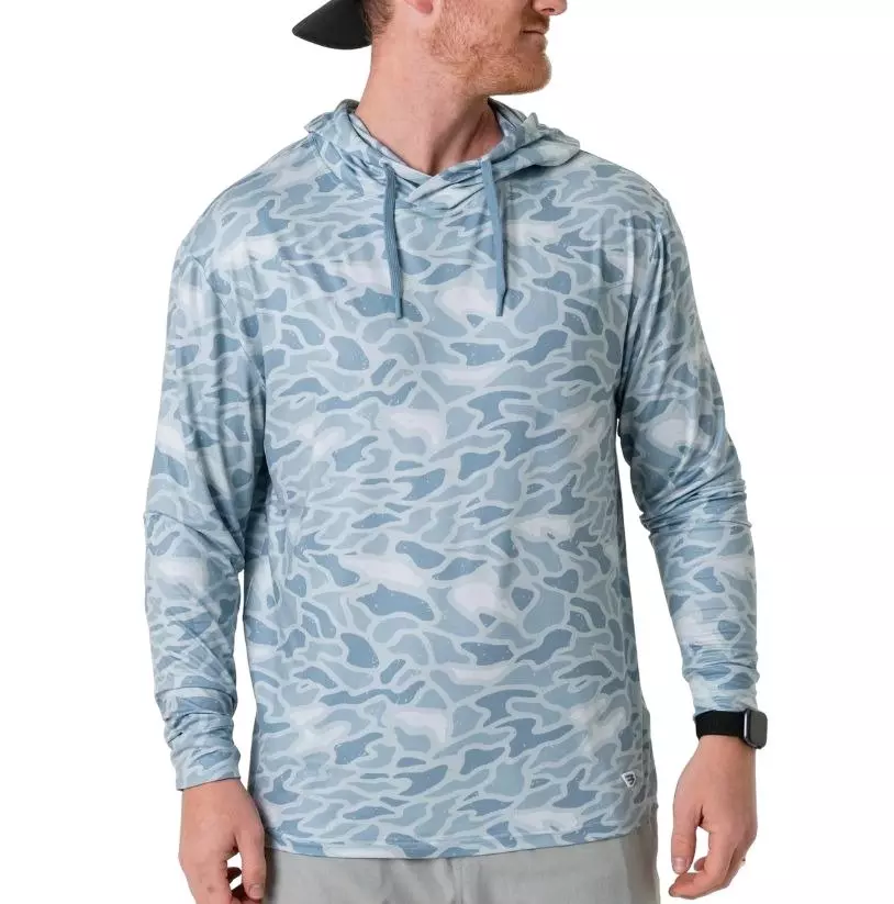 The Burlebo Men's Performance Hoodie - Seaside Camo blends 91% Polyester and 9% Spandex into a lightweight design with moisture wicking and quick-dry performance, plus UPF 50 protection. Moisture wicking fabric draws sweat away while quick-dry technology speeds evaporation.