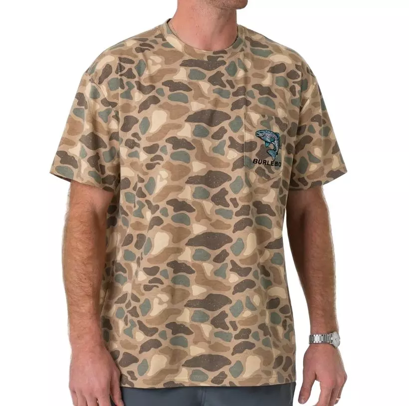 Crafted from a preshrunk blend of 60% ring-spun cotton and 40% polyester, the Burlebo Men's Pocket Tee - Pintail Camo combines durability with a soft, lightweight feel. This short sleeve tee runs true to size, delivering a flattering fit across all body types.