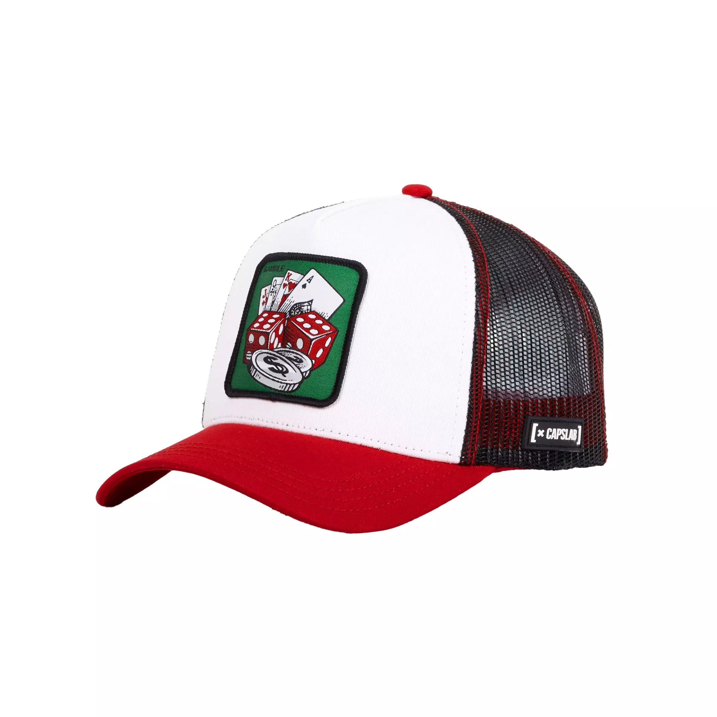Turn heads and let people know you mean business on the poker table with this Capslab Gamble Trucker Snapback Hat-White/Red. The patch on the front features all the ways you can potentially lose money. The mesh construction means you'll stay cool while you're sweating that straight on the turn. The snapback closure will keep your hat on while you jump for joy when you hit the straight on the river. Grab yours today.Features