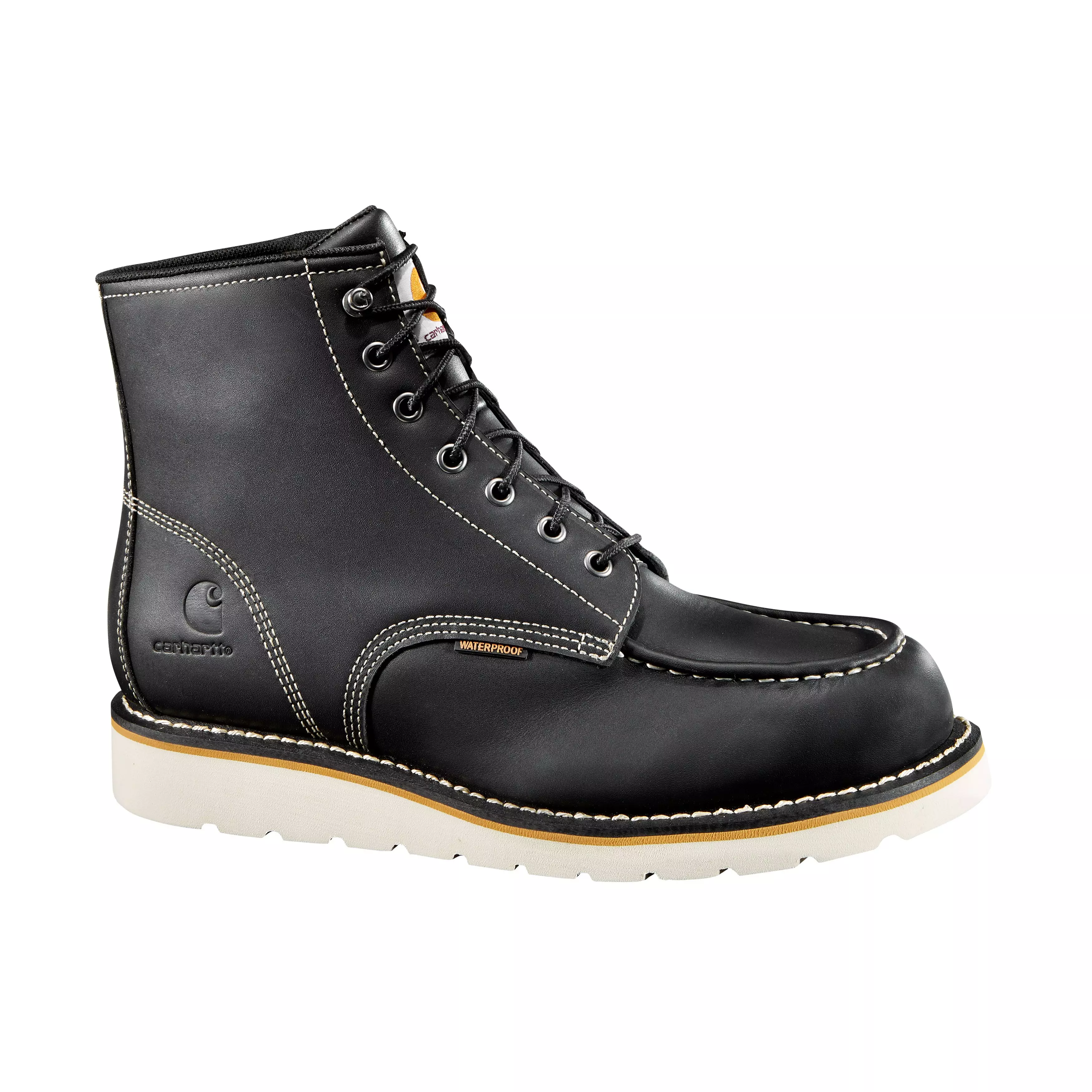 Carhartt Waterproof 6" Moc Toe "Black" Men's Wide Wedge BootWhen you work on your feet, safety and comfort come first. Made with the warehouse and construction site in mind, these Carhartt Waterproof 6" Moc Toe "Black" Men's Wide Wedge Boot give you the highest level of toe protection. The leather upper is finished with a breathable, waterproof coating so you stay dry even through heavy rain. A thick insole offers extra support. The soft toe also provides a causal look that can also be worn off the clock.