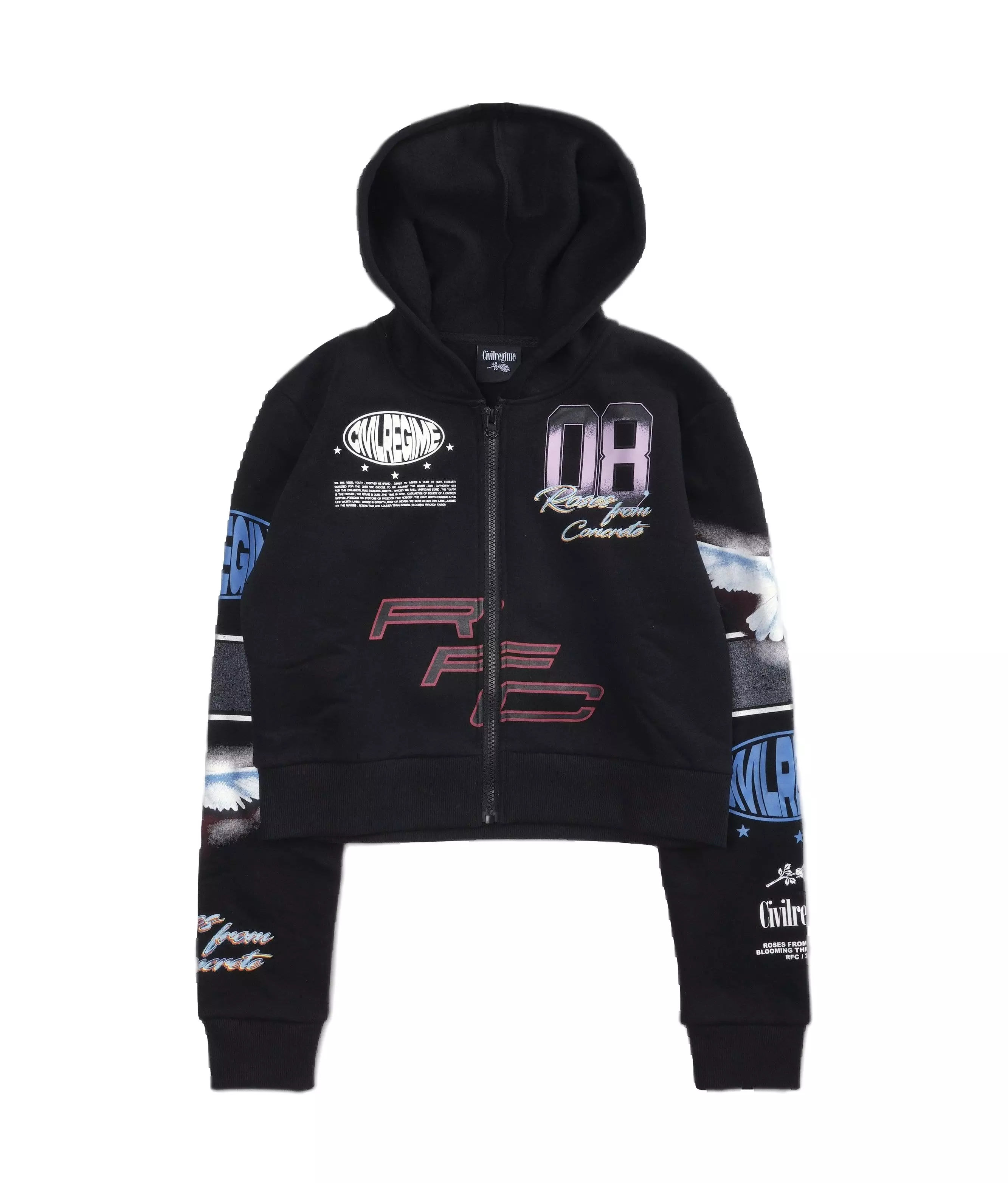Get cold weather ready in the Civil Regime Women's Crop Hoodie - Dove Black. This classic garment gives you all of that long beloved casual comfort with an added contemporary touch of cool. Colorful embroidery and fancy embellishments spice up this humble sweatshirt to pair up an aesthetic with the athletic.