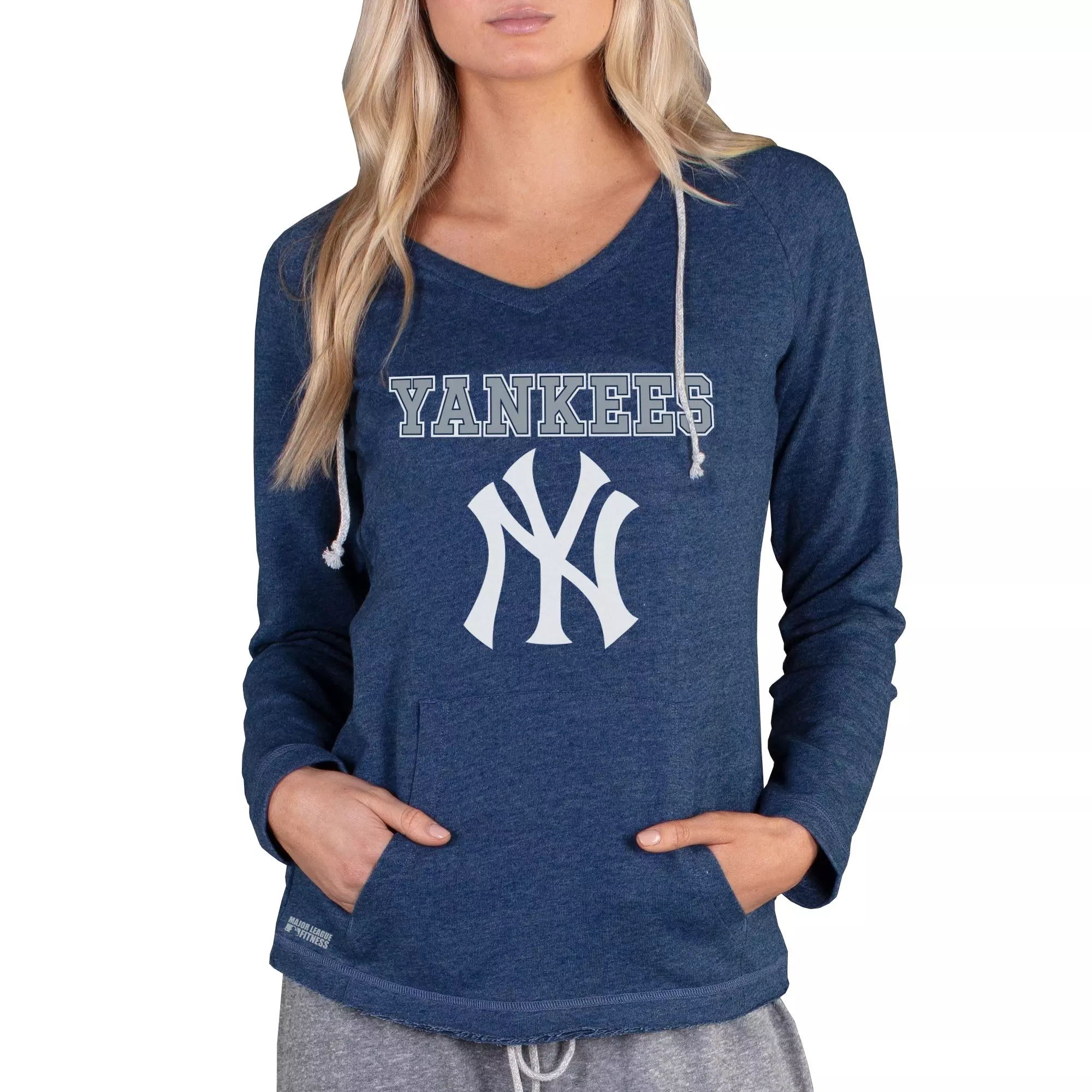 College Concepts Women's Mainstream Terry Long Sleeve New York Yankees Hoodie Top -NavyThis navy College Concepts Women's Mainstream Terry Long Sleeve New York Yankees Hoodie Top is the perfect way to show your support for the New York Yankees. Made from a comfortable polyester, cotton, and rayon terry blend, this midweight hoodie is suitable for moderate temperatures. The front pouch pocket and hood with drawstrings provide added functionality, while the screen print graphics proudly display your New York Yankees pride. Whether you're cheering from the stands or just relaxing at home, this hoodie is sure to keep you comfortable and stylish.