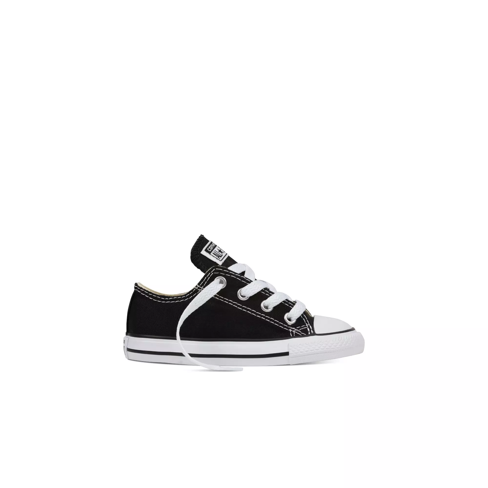 The Converse All Star "Black" Toddler Kids' Casual Shoe scales down iconic design lines into a smaller size that retains classic style and proven durability. A comfortable canvas upper adapts to small feet while moving throughout the day.