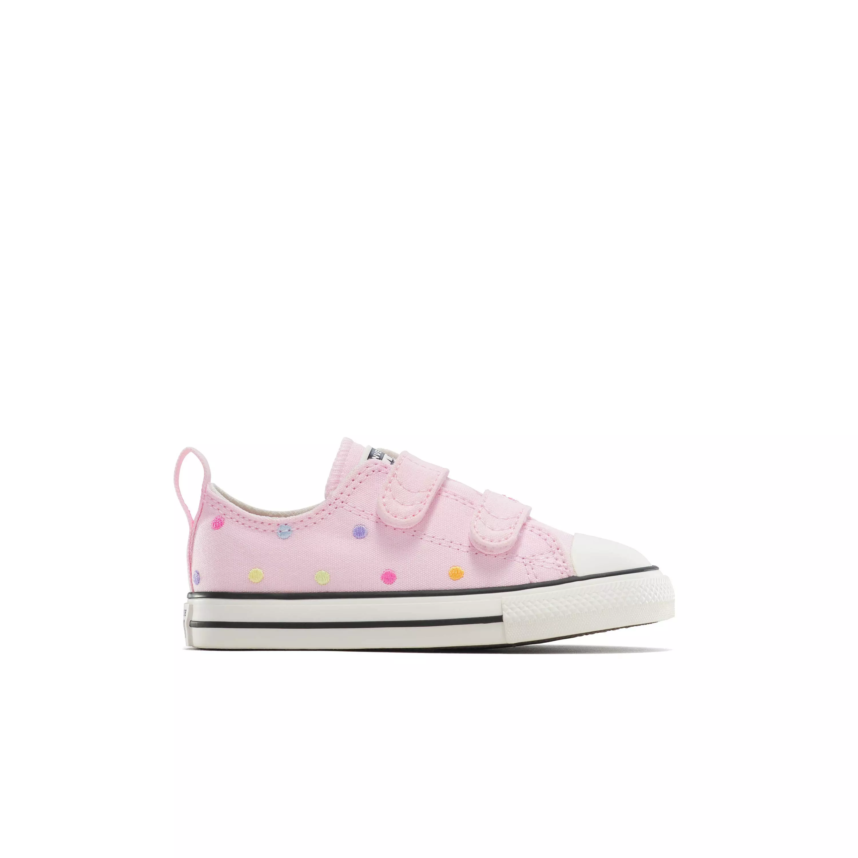 Sized down to fit tiny feet, the Converse Chuck Taylor All Star 2V "Sugar Berry/Multi" Toddler Girls' Shoe Hoop and Loop sneaker offers a classic look with rugged canvas, an easy-clean finish, a rubber toe bumper and vulcanized sole.