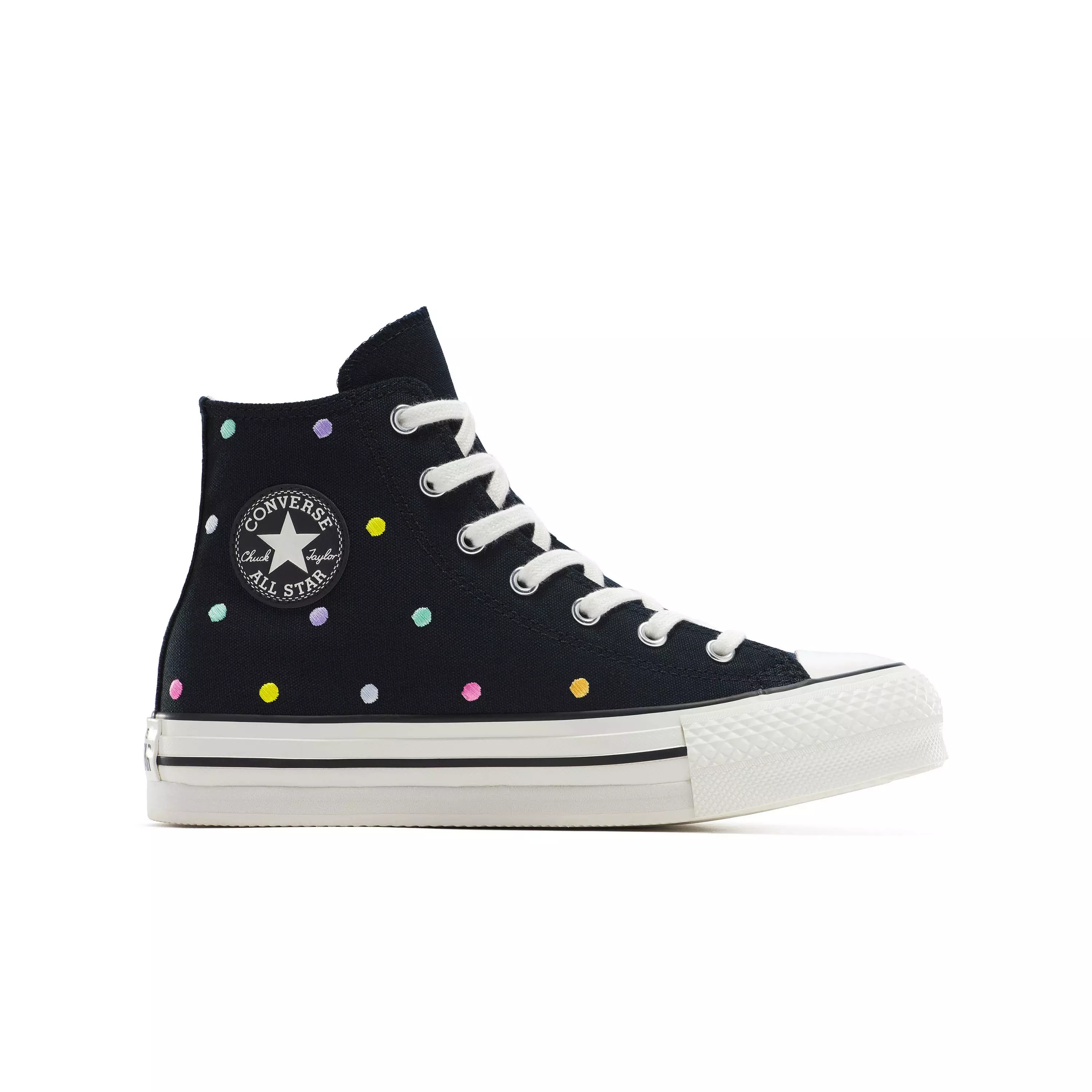 Elevate style with the Converse Chuck Taylor All Star Eva Lift "Polka Dot" Grade School Girls' Shoe. This bold platform sneaker blends the classic canvas look with a double-stacked, striped midsole that adds height and dimension.