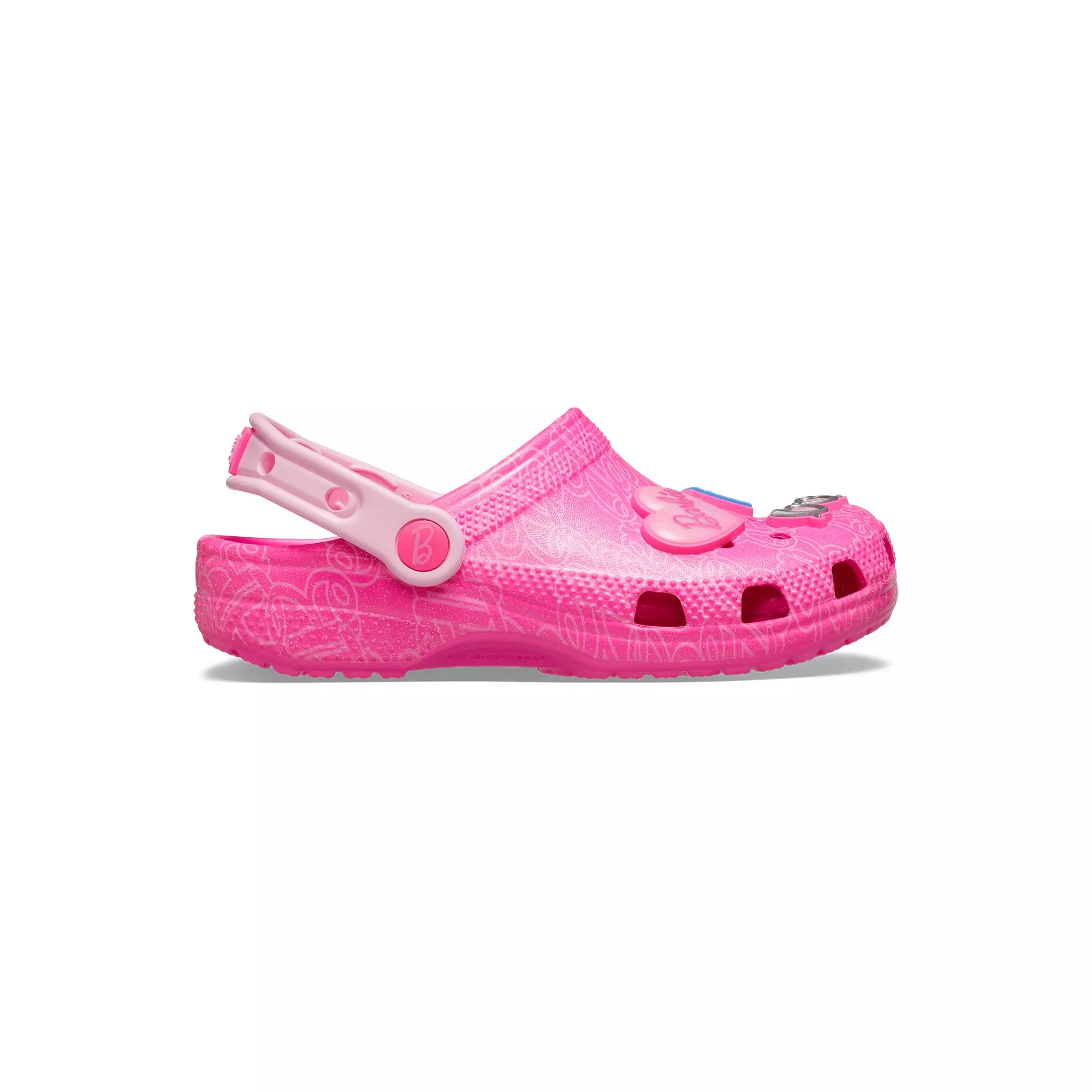The Crocs Classic "Barbie" Preschool Girls' Clog delivers comfort and playful style in a bold power-pink hue. An all-over Barbie monogram print adds chic detail, while lightweight EVA construction cushions every step and flexes easily with active movement. Built for all-day wear, this clog blends practicality with standout design.