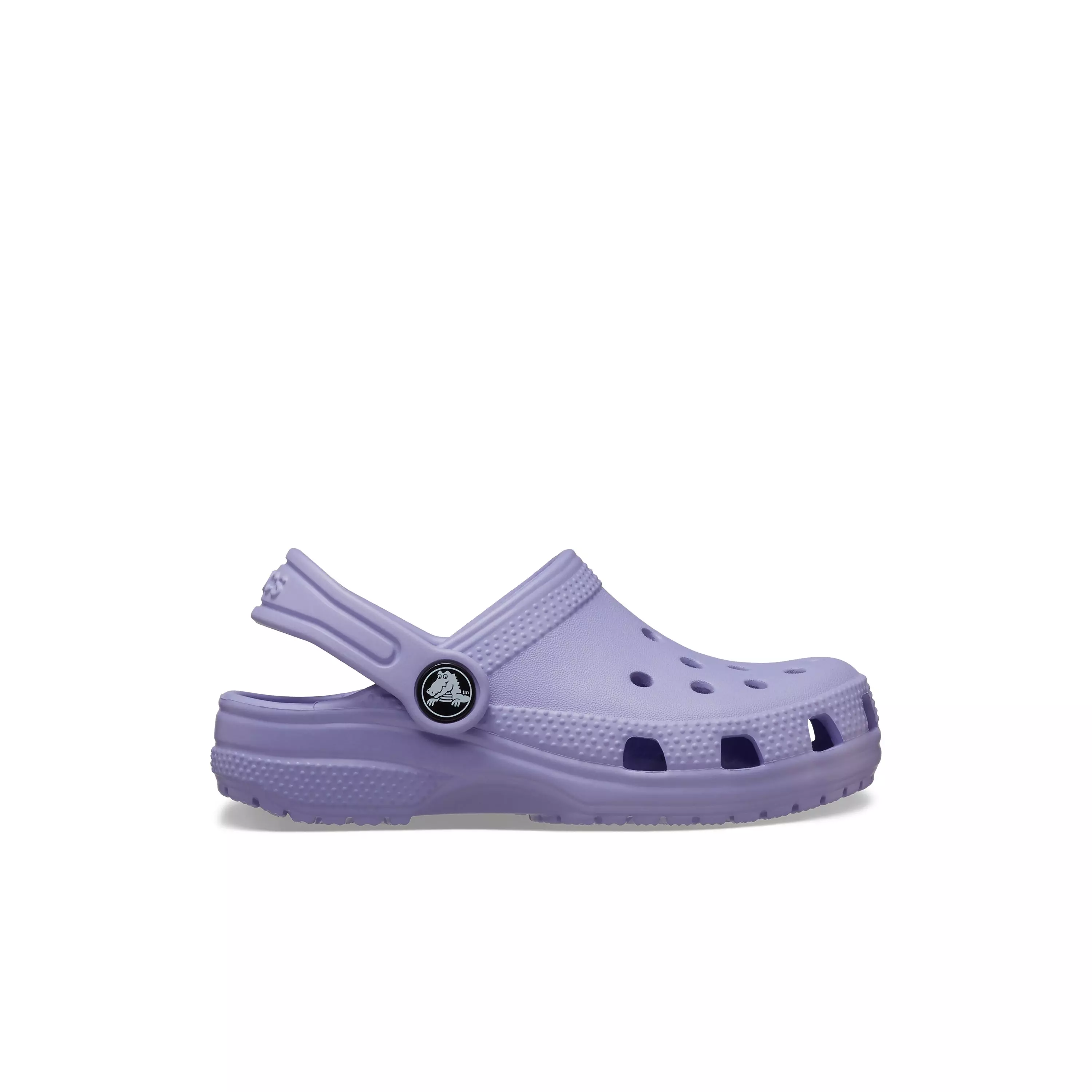 The Crocs Classic "Mystic Purple" Toddler Girls' Clog slips on and off easily, mirroring the adult Classic design. It provides lasting all-day comfort, reliable arch support and responsive, shock-absorbing cushioning through a contoured, molded footbed crafted with lightweight, durable Croslite™ material.