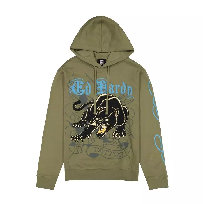 Level up your casual layers with the Ed Hardy Men's Crouching Panther Hoodie - Light Olive/Biscayne, a standard-fit pullover featuring layered archival artwork and bold logo hits. The adjustable hood and ribbed trims deliver everyday comfort with street-ready character.