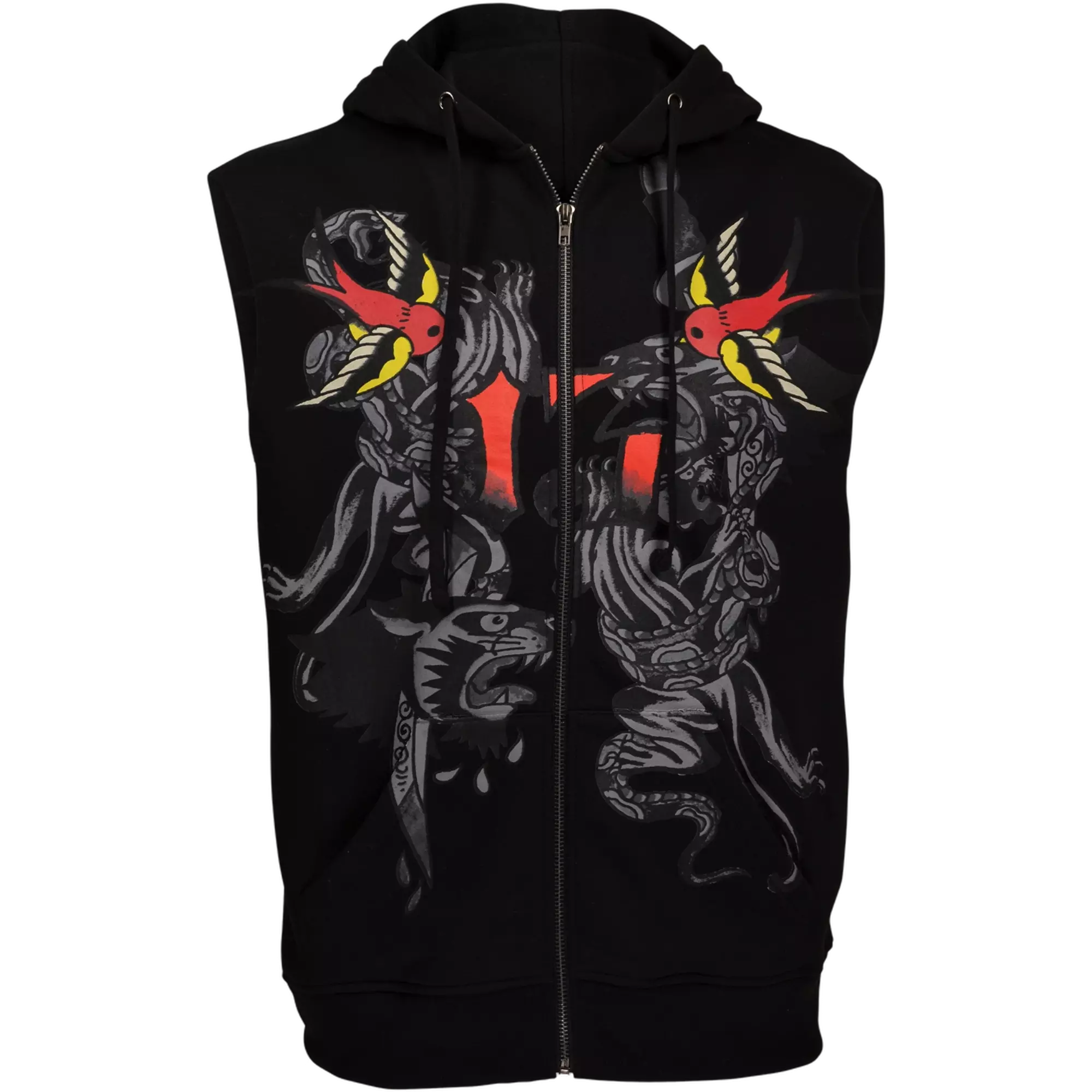 The Ed Hardy Men's Swallows Fleece Cut Off Hoodie - Black showcases a bold black tiger swallow graphic across the chest. It has cut off sleeves and a full-length zipper that offers easy layering.