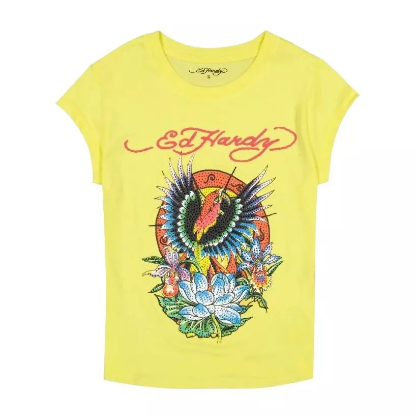 Ed Hardy Women's Phoenix Cap Sleeve Tee - Lemon features archival logos and layered Ed Hardy graphics. Bold graphics elevate casual outfits with eye-catching detail. Lightweight feel suits daily wear.