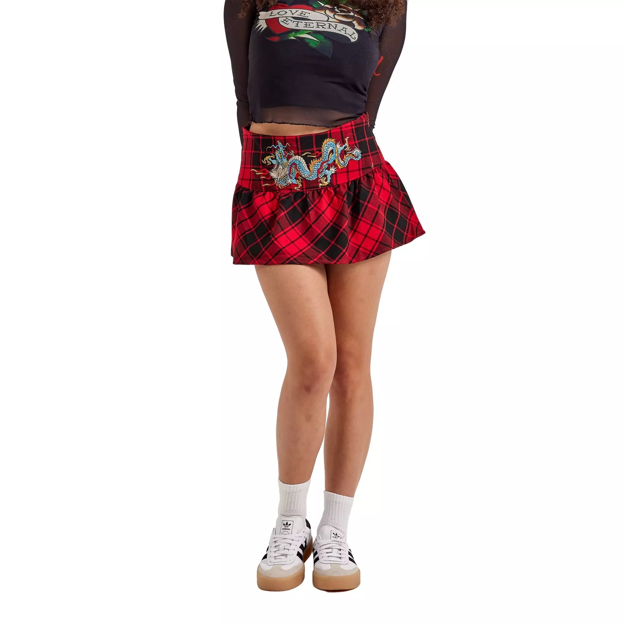 The Ed Hardy Women's Plaid Dragon Skirt merges punk rock attitude with tattoo art. It features a bold dragon graphic set against a classic plaid pattern. It embraces rebellious style, fusing urban edge with classic patterns.