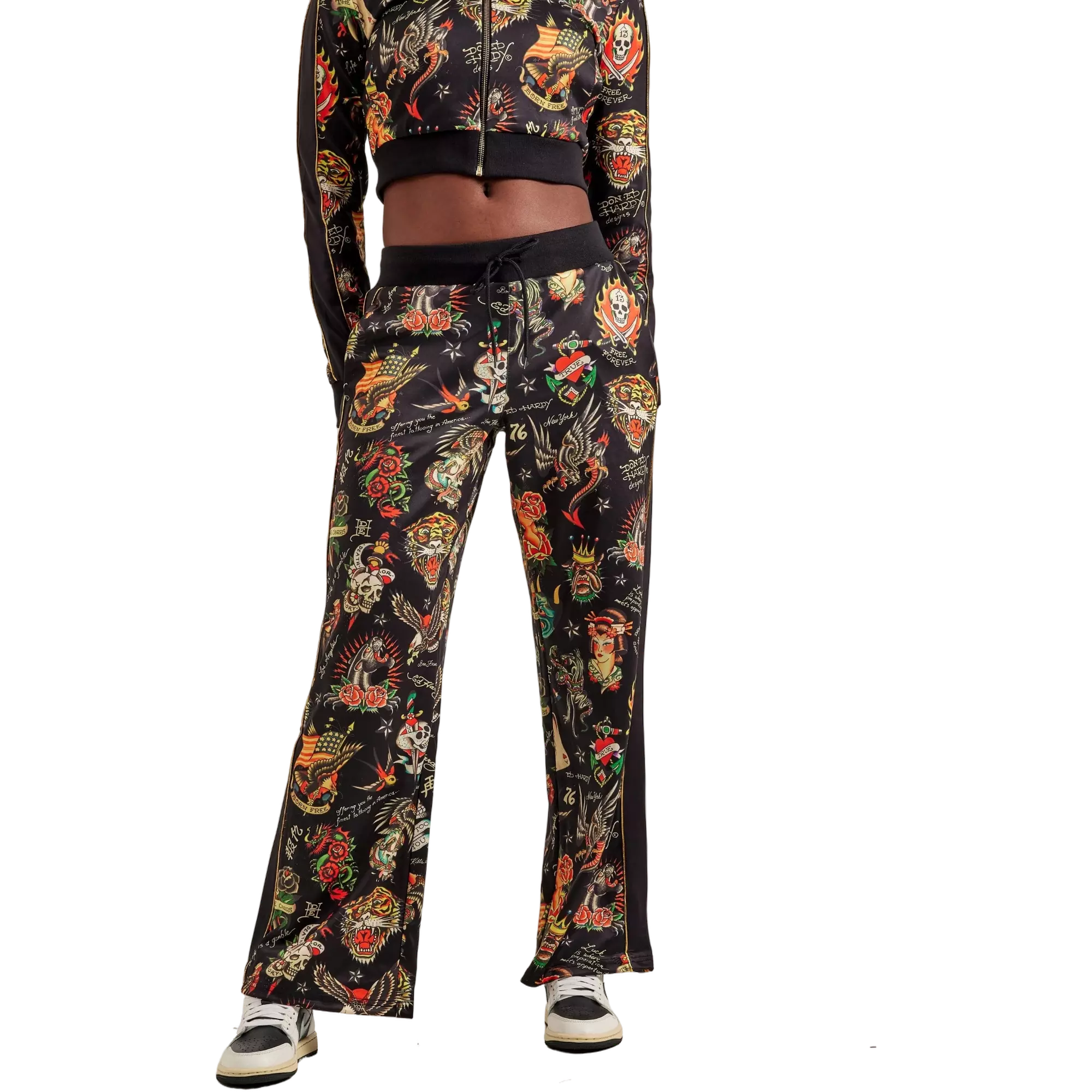 The Ed Hardy Women's Shrunken Flashboard Track Pants showcase vintage tattoo-inspired graphics with vibrant colors, delivering a bold, retro aesthetic.