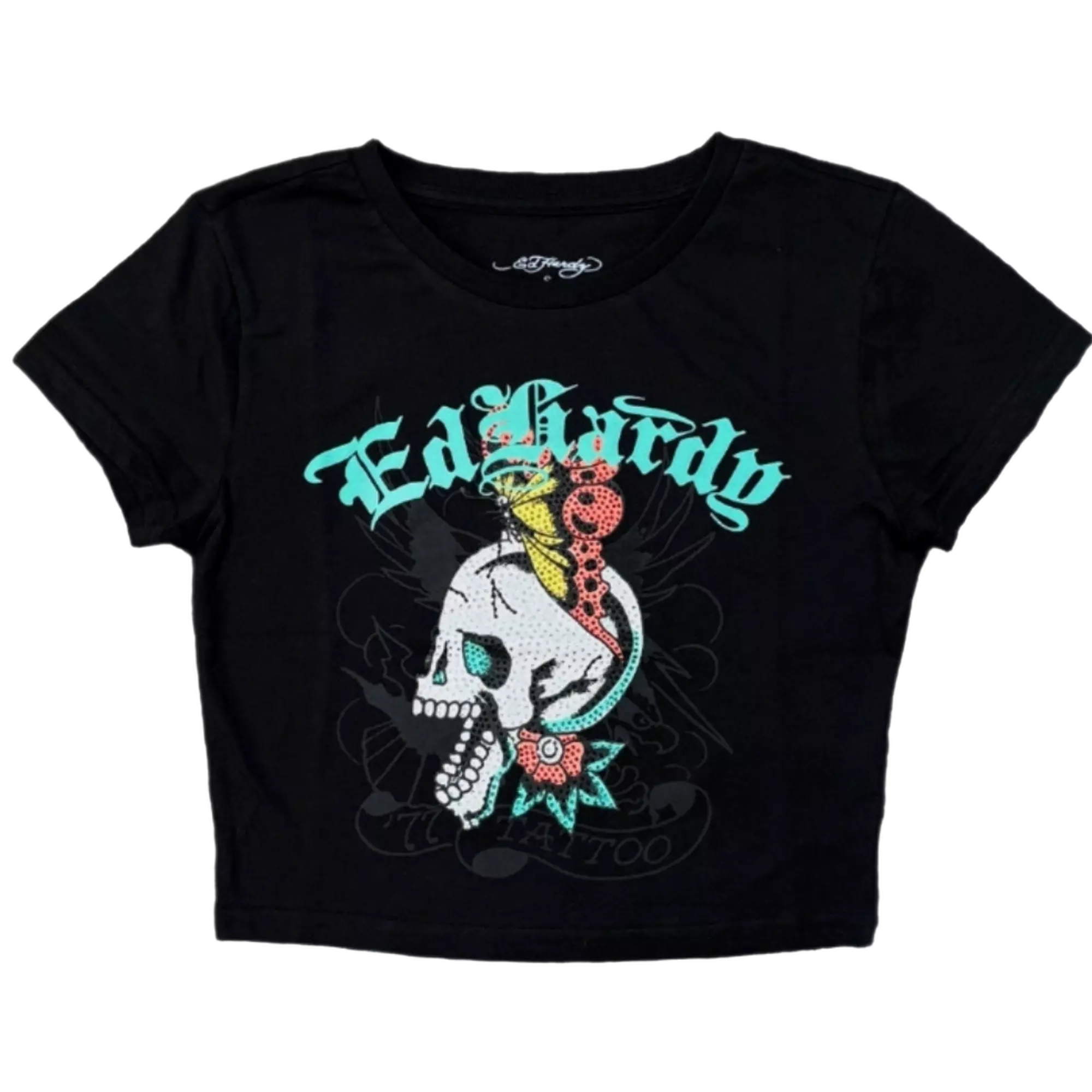 The Ed Hardy Women's Skull Baby Tee blends cotton and polyester to deliver everyday comfort. The soft knit feels smooth against skin. It features an eye-catching skull graphic print on both front and back, adding bold style to every look.