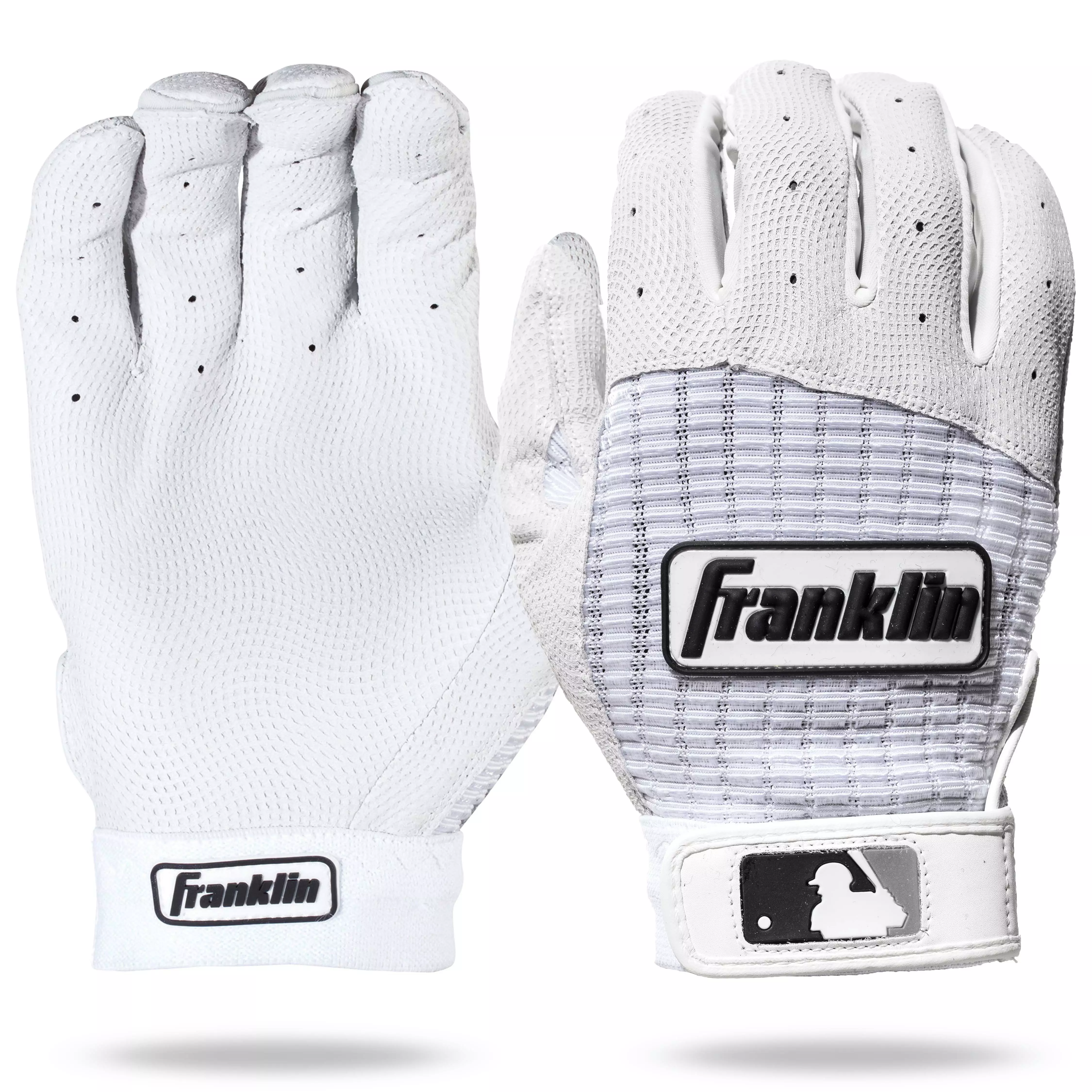 The batting glove that started it all, the Franklin Men's Pro Classic Series Batting Gloves White represents the heritage of our batting glove line. Designed with the help of MLB Hall of Famer Mike Schmidt, these pro quality batting gloves help revolutionize the game. The Pro Classic™ batting gloves are made with premium quality leather, a flexible hand back, and a seamless leather palm for a comfortable, responsive fit and feel. Designed to improve bat grip in all weather conditions, these batting gloves are the perfect accessory to take control of your at bats. A time honored classic of both baseball and softball players, these batting gloves come in a variety of colors and sizes for adult and youth players. These batting gloves are even worn by some of our MLB pro baseball players, so they are designed to compete at the highest level. So if you are looking to improve your at bats and take control of your game, grab yourself a pair of Franklin Sports Pro Classic™ batting gloves today!Features