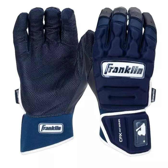 Franklin Sports CFX PRT Protective Batting Gloves - NavyProtect your hands when you step to the plate with the Franklin Sports CFX PRT Protective Batting Gloves - Navy. These protective, padded batting gloves are designed to keep baseball and softball players' hands secure so they can step into the box with confidence. Built with a protective soft-shell layer, these gloves offer increase protection against hit by pitches. The soft shell hardens on impact to help reduce the chance of injury while still remaining flexible and comfortable. Made with our classic, CFX Pro leather and design, these premium batting gloves are built to play at the highest level. The soft, lightweight handback is designed for flexibility and comfort while providing additional support and protection. The next time you step into the batter's box, bring yourself some peace of mind by grabbing a pair of Franklin Sports' CFX Pro PRT Baseball and Softball Batting Gloves today!