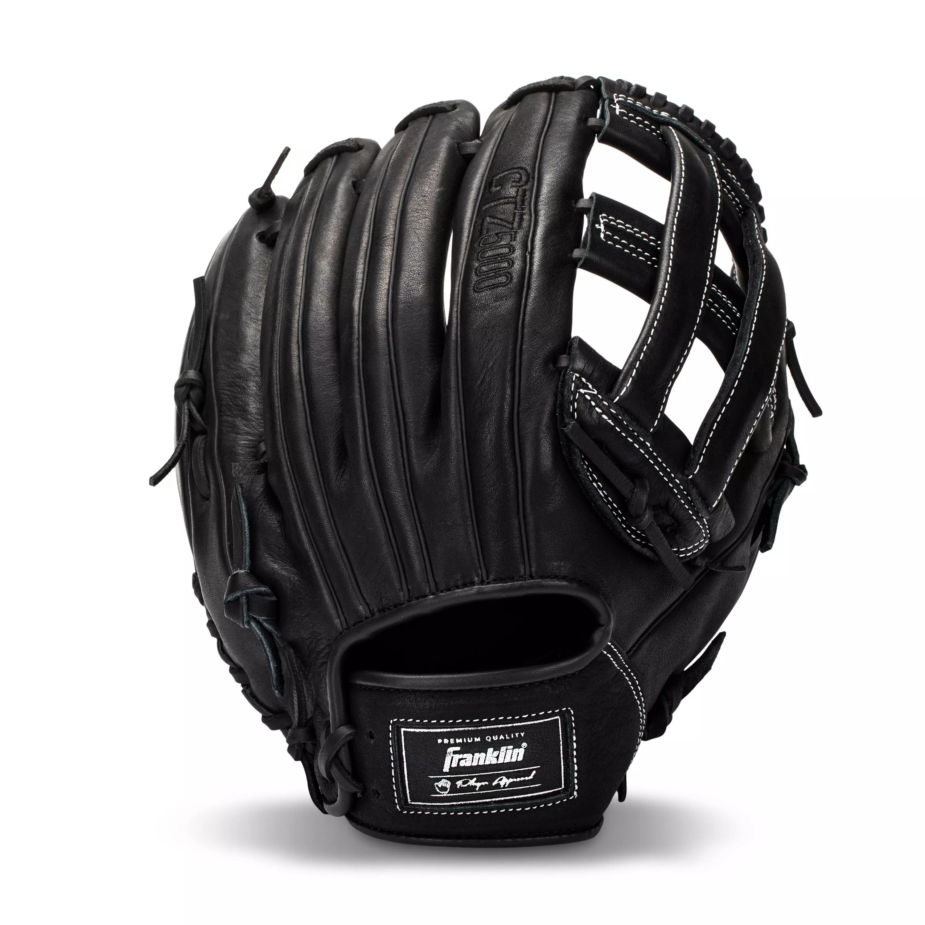 The Franklin Sports CTZ5000 13" Baseball Fielding Glove RHT - Black is constructed from premium cowhide leather to play at peak performance for baseball players of all ages. The black cowhide leather is both soft and durable, making it lightweight and easy to break in while also being tough enough to use season after season. The super-soft palm lining is designed to keep your hand cool and comfortable, so you can practice and play without blisters or sweaty palms. Plus, the chrome stitching and logo treatment give this mitt a modern, professional feel so you can look and play your best. No matter what position you play, there is a CTZ5000 glove for you, so grab yours and hit the field today!Features
