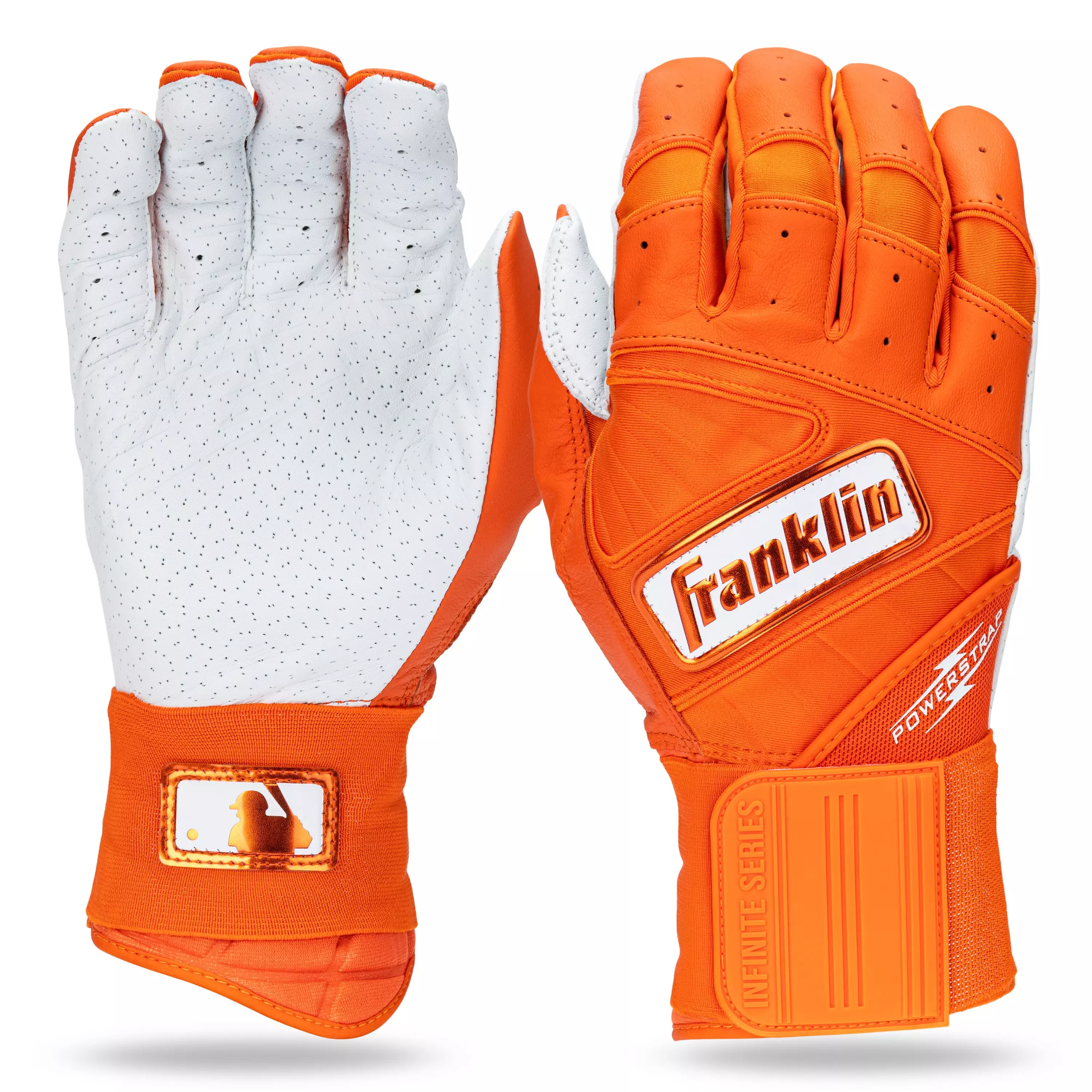 If you're looking for baseball and softball batting gloves designed for the optimal fusion of performance, durability and support, look no further than the FFranklin Sports MLB Adult Powerstrap Batting Gloves - Orange. Crafted in tandem with our MLB pro players, the thicker leather maintains a superior softness without compromising the Franklin bat feel we all know and love. Designed for premium durability, the Powerstrap Infinite batting gloves are made to last swing after swing, and are perfect for use in the cages for batting practice or out on the field for games. Constructed with micro-perforations in the palm for added airflow to keep your hands cool and dry, and a seamless and patch-free palm design that provides a responsive feel on the bat with no bunching or seams in the way. Finished with our unique 50mm extra-tall wrist wrap and Powerstrap closure tab for reinforced wrist stability to provide the best support in the game. So if you're looking to practice your swing in the batting cages, or looking for additional grip and stability at the plate, grab yourself a pair of the new Powerstrap Infinite batting gloves from Franklin Sports today.Features