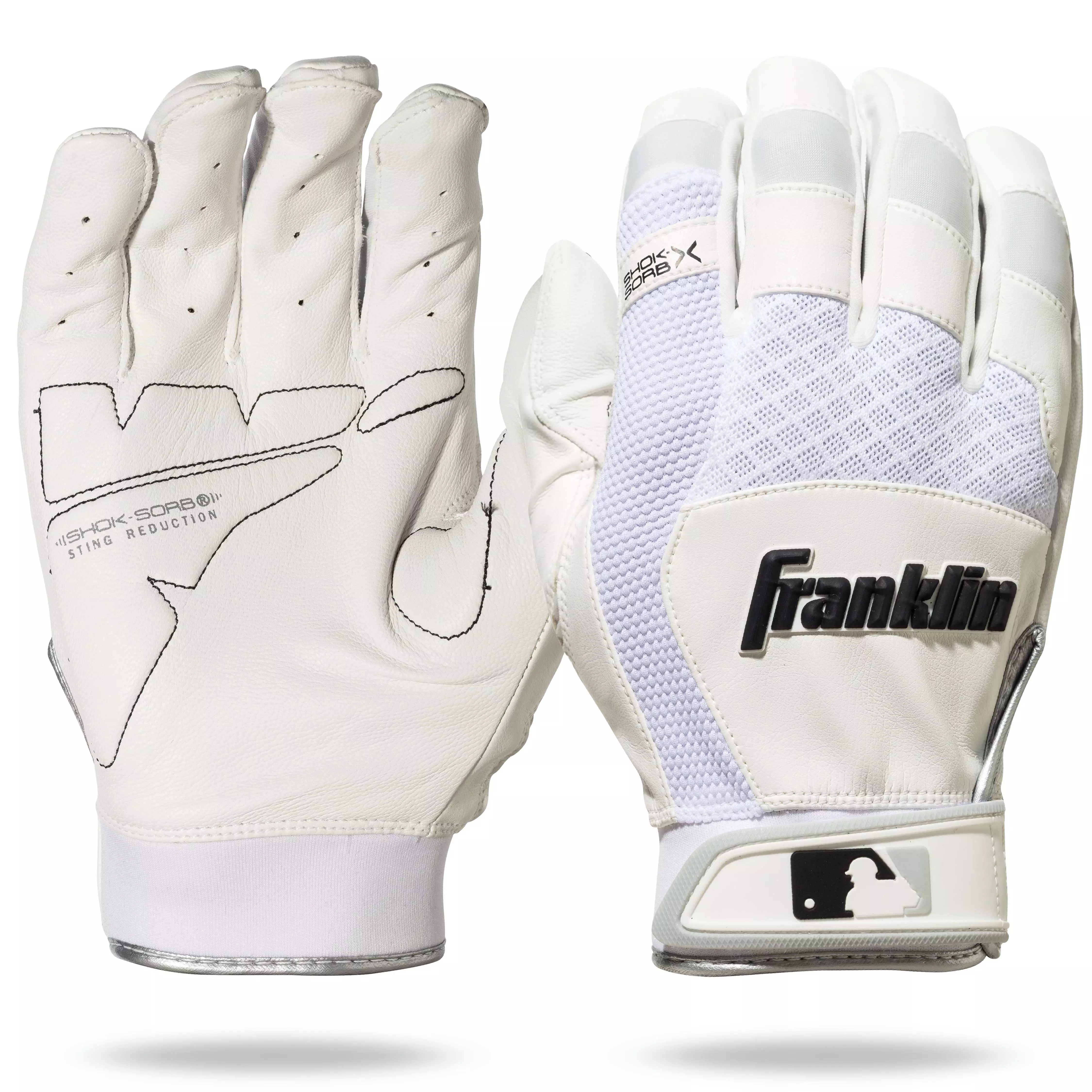 Take the pain out of your at bats and grab a pair of the padded Franklin Sports Shok-Sorb X Batting Gloves today! These batting gloves are designed with extra palm padding to eliminate the sting from the bat in cold weather. Whether you're playing baseball or softball, the sting from the bat on a cold day can cripple a hitter's hands. These pro quality leather batting gloves are the perfect accessory for adult and youth hitters to protect their hands in every at bat. The high quality leather improves grip, and the mesh vents in the handback help your hands breathe for a cool comfortable fit. Plus, the Shok-Sorb batting gloves come in a variety of colors and adult and youth sizes, so every baseball and softball player can get the perfect pair of batting gloves for them. So grab yourself a pair of Shok-Sorb batting gloves and step to the plate today!Features