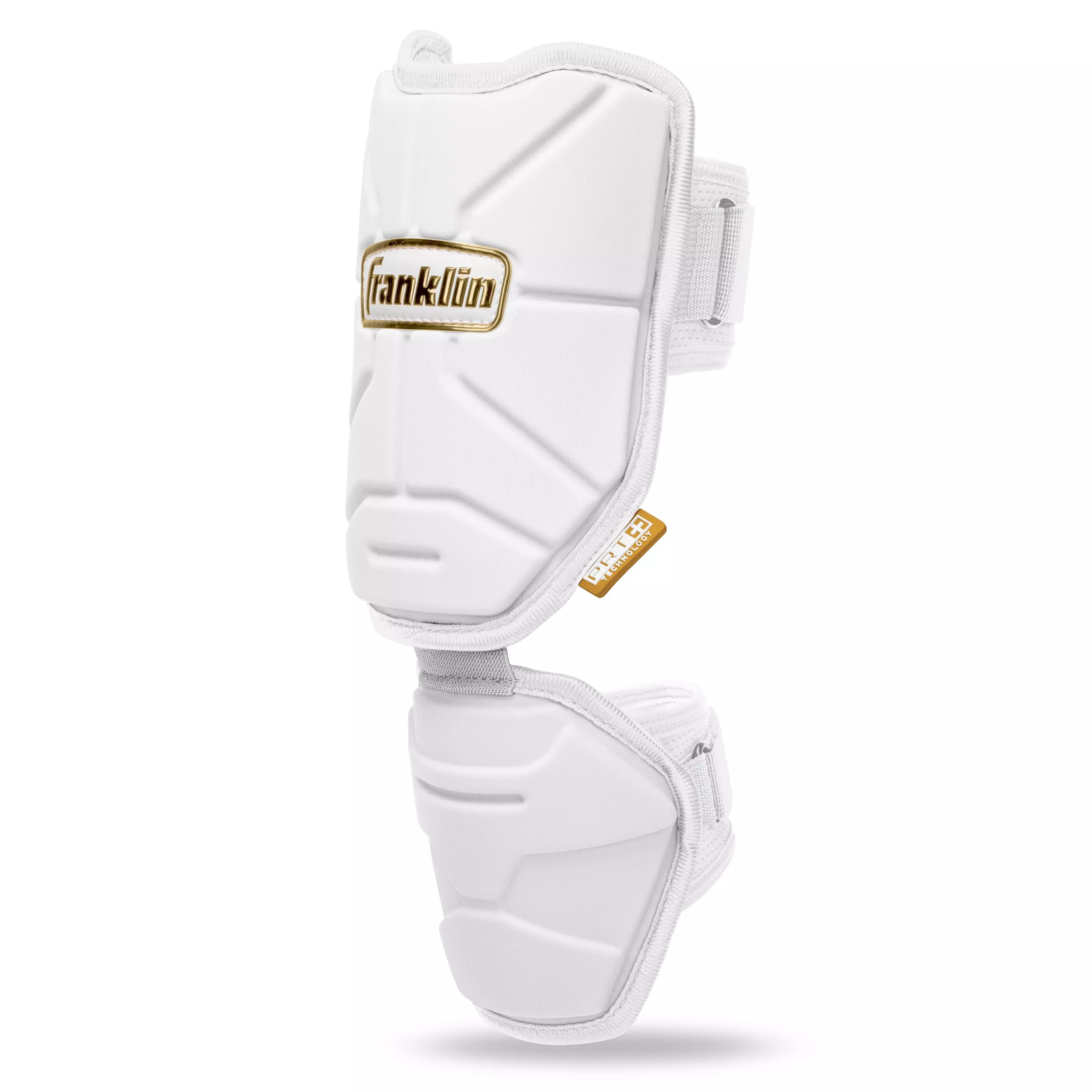 Protect yourself at the plate with the Franklin Sports Youth PRT Protective Elbow Guard - White/Gold! Give yourself confidence and peace of mind when you step into the batter's box with this protective elbow and forearm shield. Hit-by pitches can be costly in terms of pain and injury, and the PRT baseball and softball elbow guard is the perfect piece of equipment to keep players safe and in the game. This elbow and forearm protector pad is designed to absorb impact from the ball to reduce the likelihood of injury. This adjustable, youth size baseball elbow guard is easy to strap on and is designed to be sleek and comfortable so it won't impede your swing. The soft-shell protector hardens on impact to lessen the damage caused by the ball and gives players added confidence during their at-bat. The elbow and forearm protector also offers double the coverage of other elbow guards on the market by extending down the forearm for additional protection. Designed to be sleek and lightweight, this elbow guard is designed to fit comfortably for both right hand and left hand hitters. Plus, over time, the flexible interior shell will mold to the shape of your elbow for a unique, comfortable fit. So step to the plate with ultimate confidence and protection for your next at bat and grab your PRT + Baseball Elbow Guard today!Features