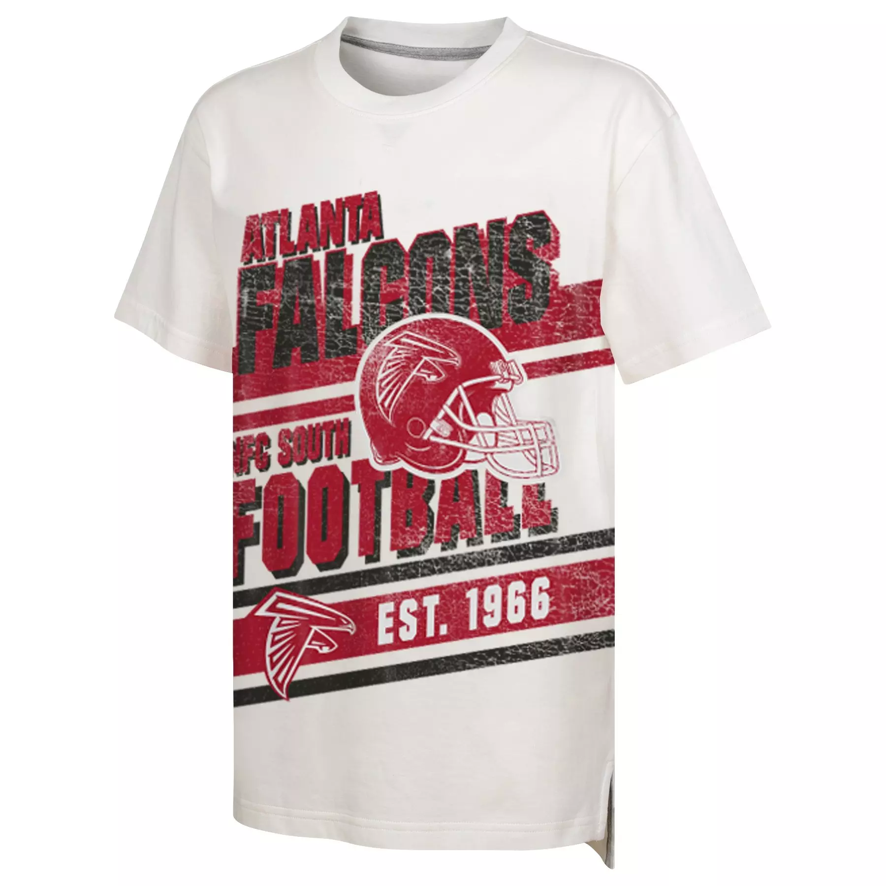Show your team pride with this Gen 2 by Outerstuff Youth Atlanta Falcon Get Loud Tee-White. Featuring a bold, distressed print of the Atlanta Falcon logo and helmet, this shirt is designed for die-hard fans. The large “Atlanta Falcon Football” text, along with the the year the Falcons were established, adds a classic, retro look. With its relaxed fit and soft fabric, it’s perfect for game days or casual outings, ensuring you stay comfortable while representing your team.Features