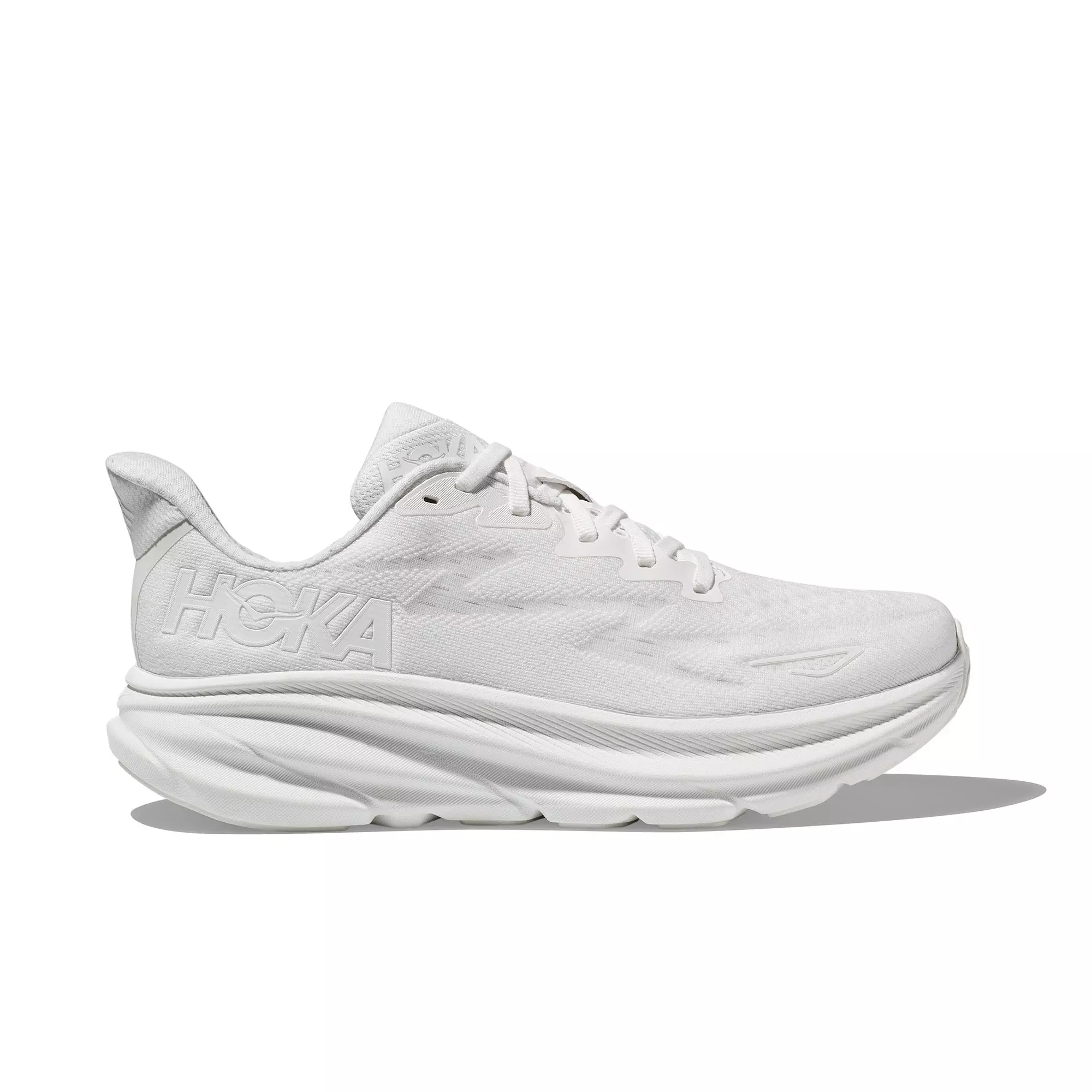 Light and plush for everyday miles. The ninth iteration of our award-winning Clifton franchise has launched, lighter and more cushioned than ever before. Eliminating weight while adding 3mm in stack height, the new Hoka Clifton 9 "White/White" Women's Running Shoe delivers a revitalized underfoot experience with a responsive new foam and improved outsole design. Removing overlays and hotmelts, the stripped back upper has been consciously crafted with a plusher heel, reflective heel panel, and streamlined tongue with single side medial gusset.Features
