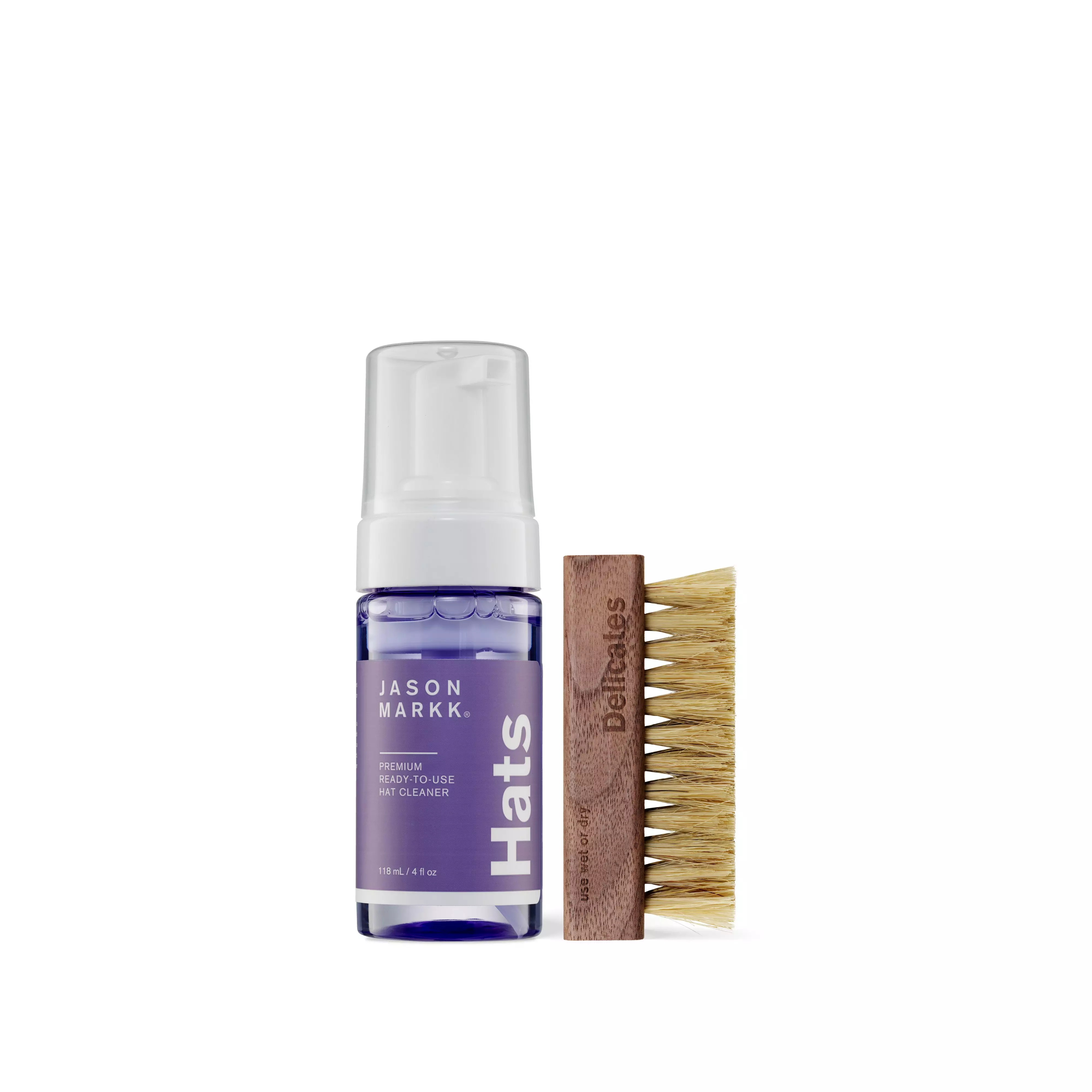 Keep hats spotless using the Jason Markk Hat Care Kit. This kit includes a fragrance-free solution that cleans gently yet effectively, plus a soft-bristled Premium Brush. The gentle formula suits cotton, wool, felt, corduroy, polyester and more.