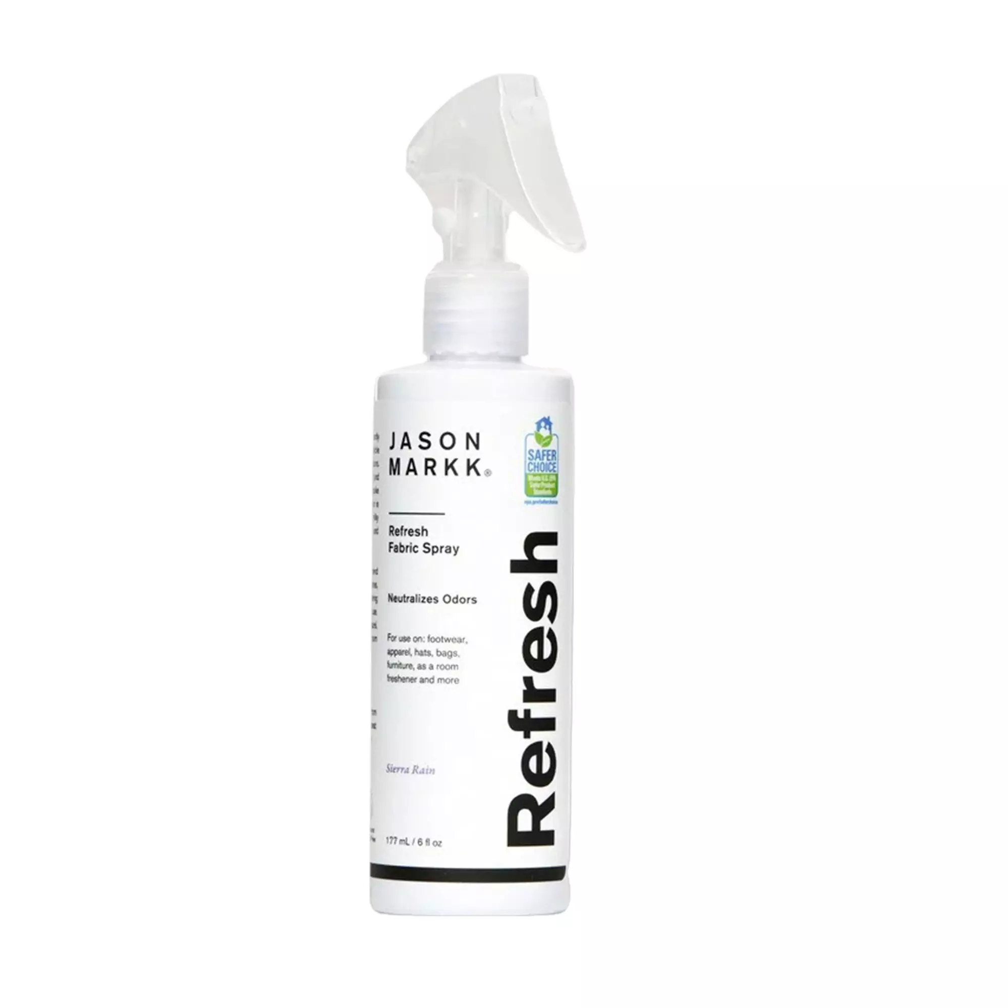 The Jason Markk Refresh Spray is VOC-free and free of PFAS, PFOA, and PFCs. It forms a breathable barrier that dries clear, shielding against liquid and dirt. The non-aerosol mist dispenses an even, fine spray across materials like leather, suede, nubuck, canvas, cotton, nylon, knit, woven, and mesh. Avoid using on unsealed or vegetable-tanned leather.