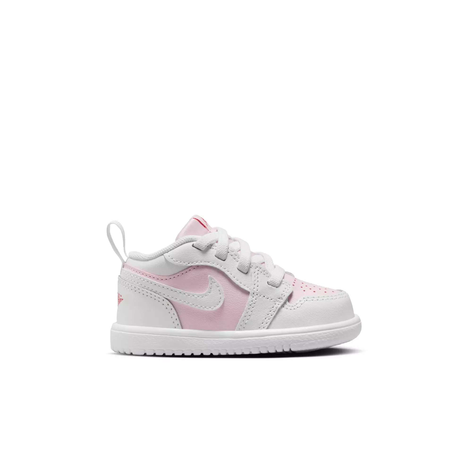These Jordan 1 Low Alt "Pink Foam/White/Fire Red" Toddler Girls' Shoe offers a hook-and-loop strap that opens easily and secures little feet. The classic Jordan silhouette pairs the Pink Foam upper with white panels and Fire Red accents.