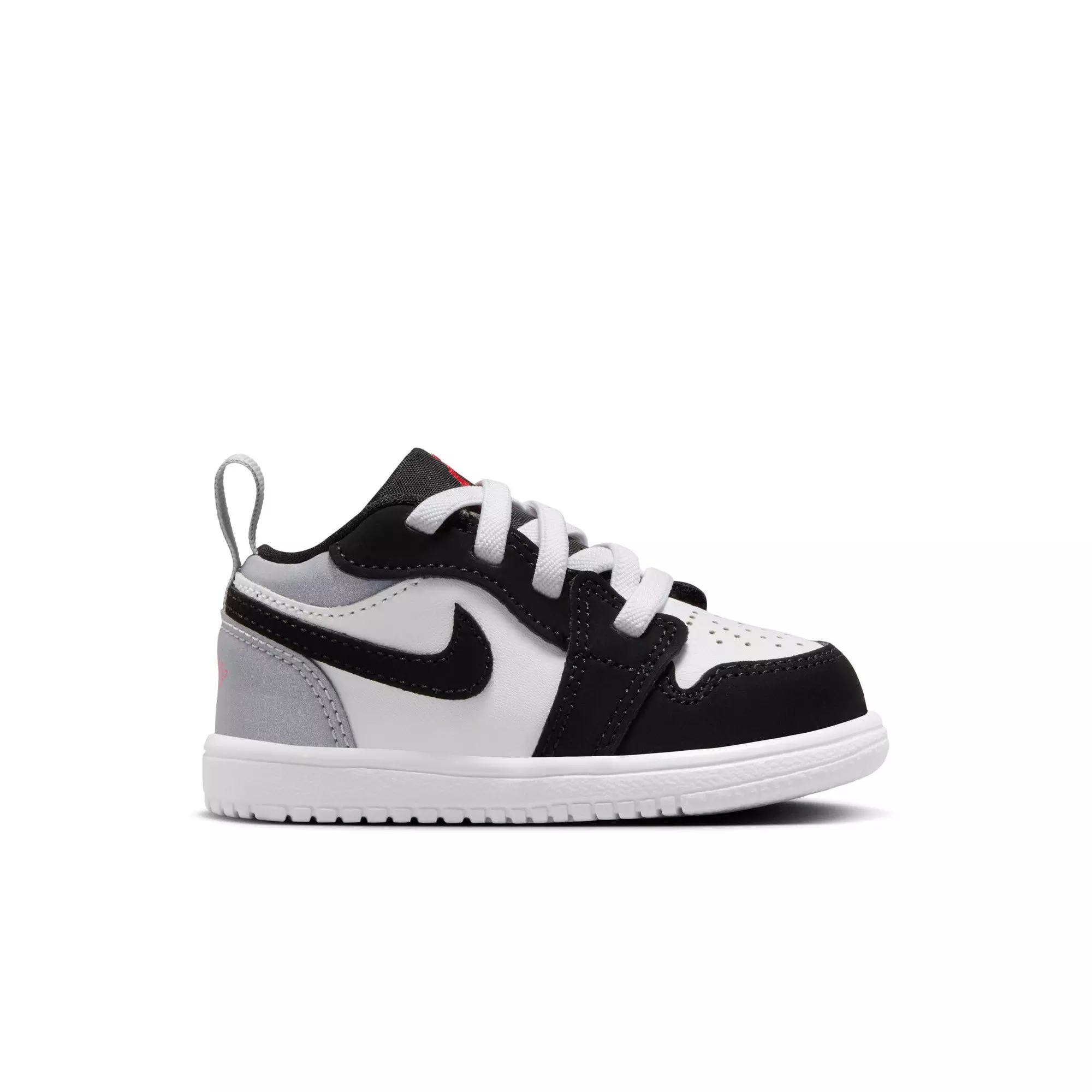 The Jordan 1 Low Alt SE "White/Fire Red/Black/Matte Silver" Toddler Boys' Shoe features a decorative lace area that lifts to a secure hook-and-loop closure, eliminating ties.