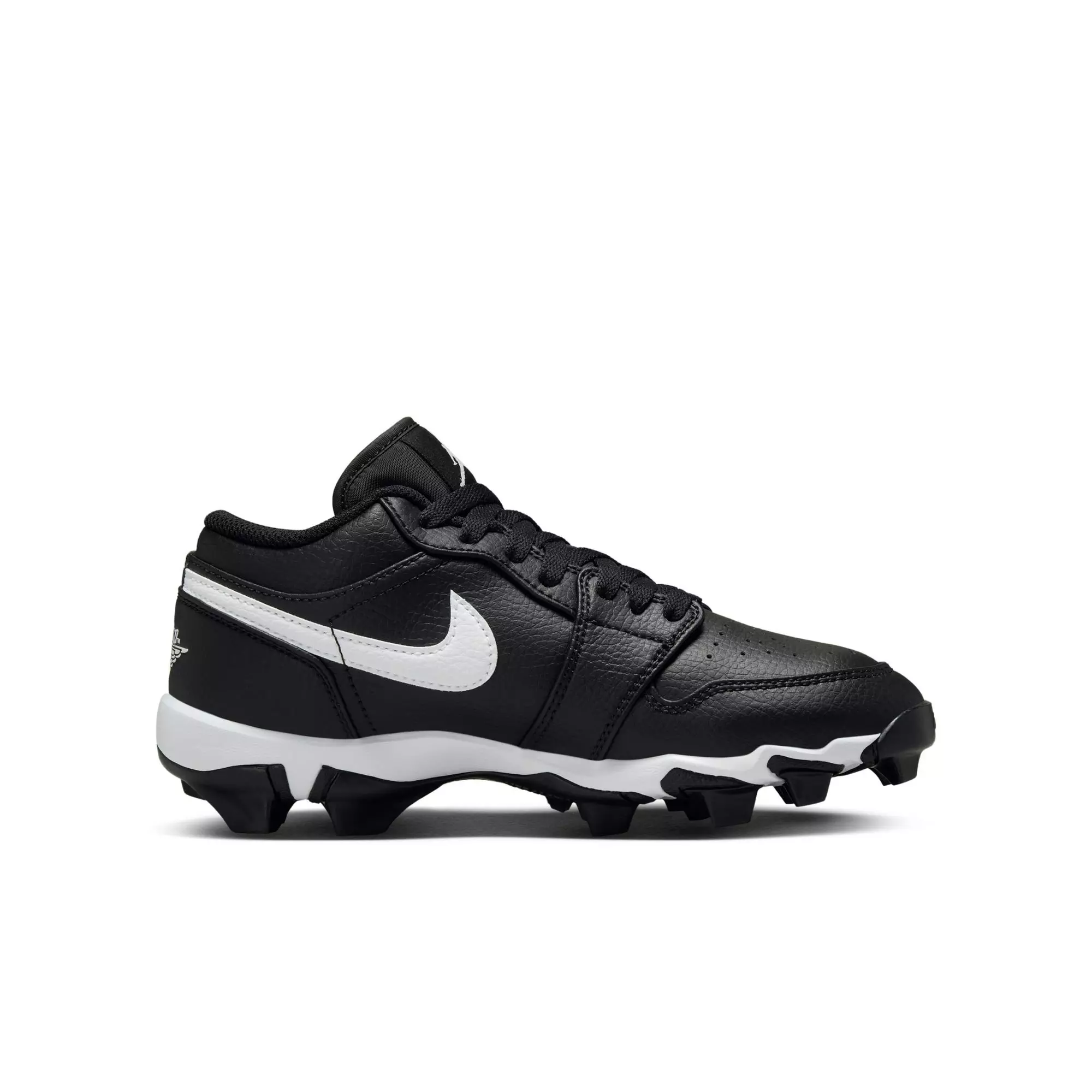 Built for agility across sports, the Jordan 1 Low "Black/White" Grade School Boys' Multisport Cleat combines a classic profile with performance traction. A durable synthetic upper supports fast cuts, while forefoot flexibility helps keep feet comfortable through practice and play.Strategically placed molded studs deliver grip for quick starts, stops, and pivots on firm natural surfaces. A secure lace-up design and padded collar offer lockdown and comfort so kids can focus on making plays, game after game.