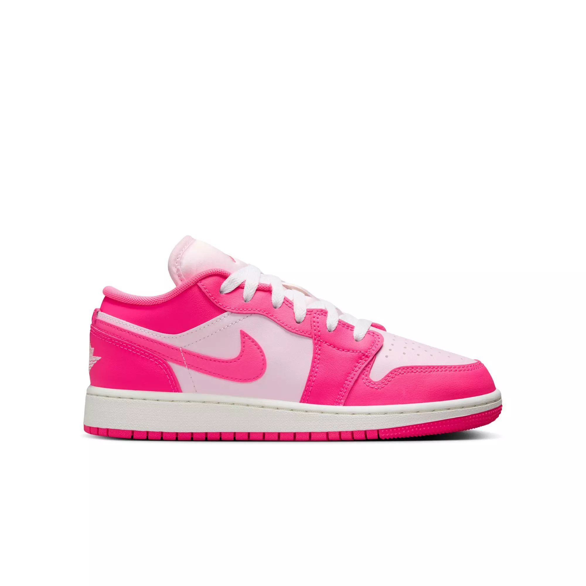 The Jordan 1 Low "Pink Foam/Hyper Pink/Summit White" Grade School Girls' Shoe delivers an iconic look that lasts, pairing the classic low-top silhouette with the original design and premium materials that stand up to daily wear.