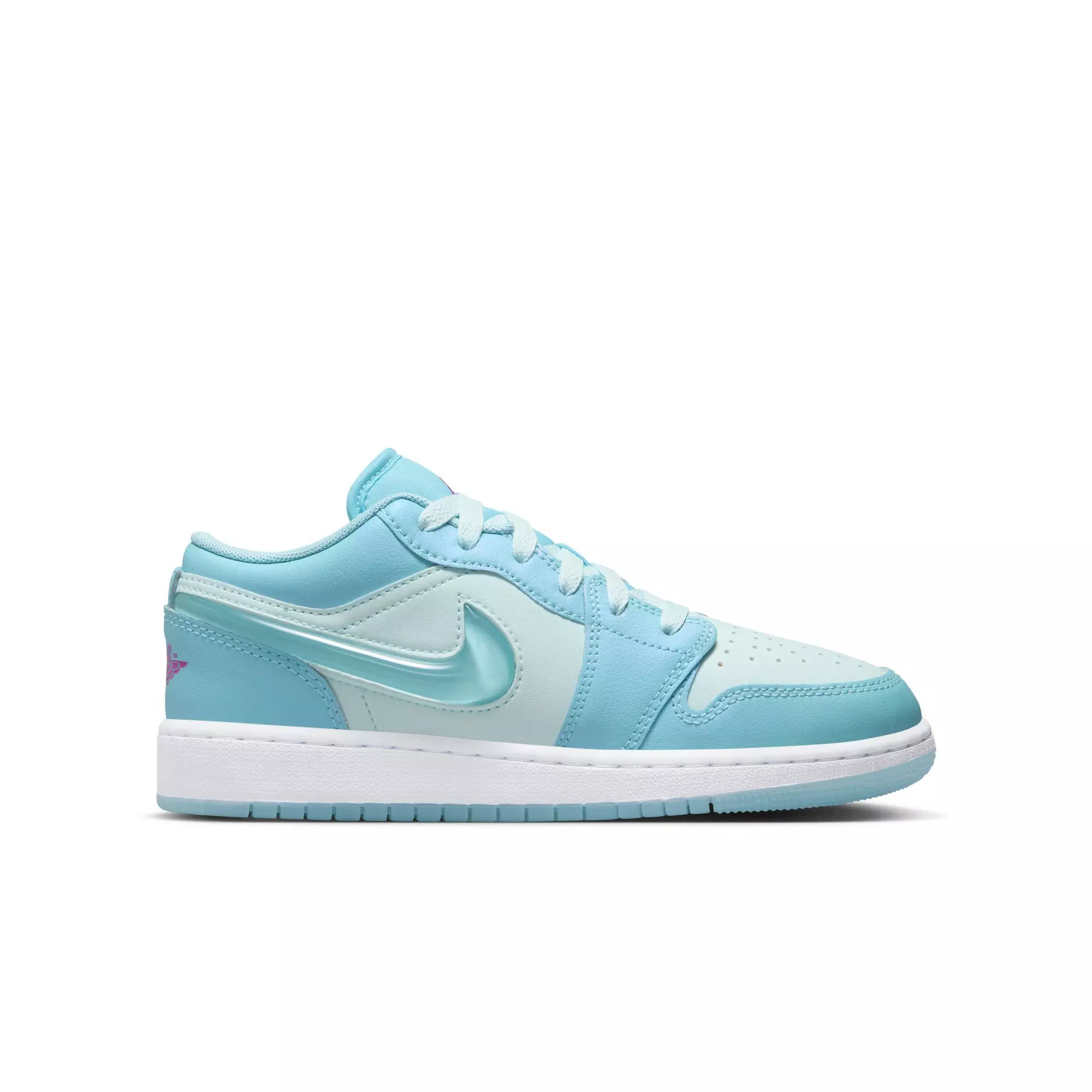 A style icon fit for style icons. This Jordan 1 Low SE "Aquarius Blue/Glacier Blue" Grade School Girls' Shoe pairs premium materials with eye-popping details like a gel-like Swoosh logo and icy rubber outsole for a look that turns up the heat.