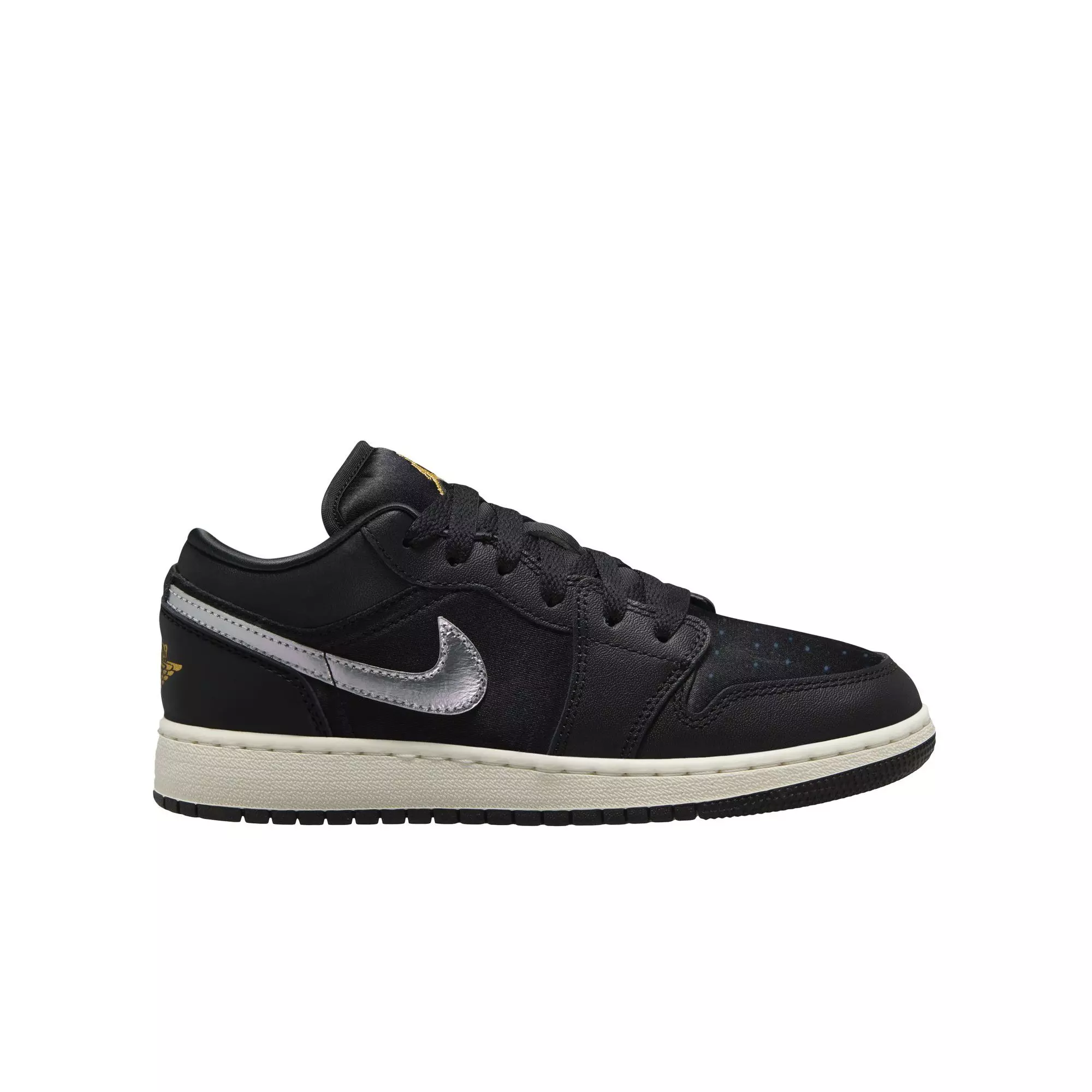 The Jordan 1 Low SE "Black/Metallic Silver/Sail/Metallic Gold" Grade School Boys' Shoe delivers a balance of everyday wear and celebratory style. Smooth leather pairs with shiny satin, creating a premium standout look.