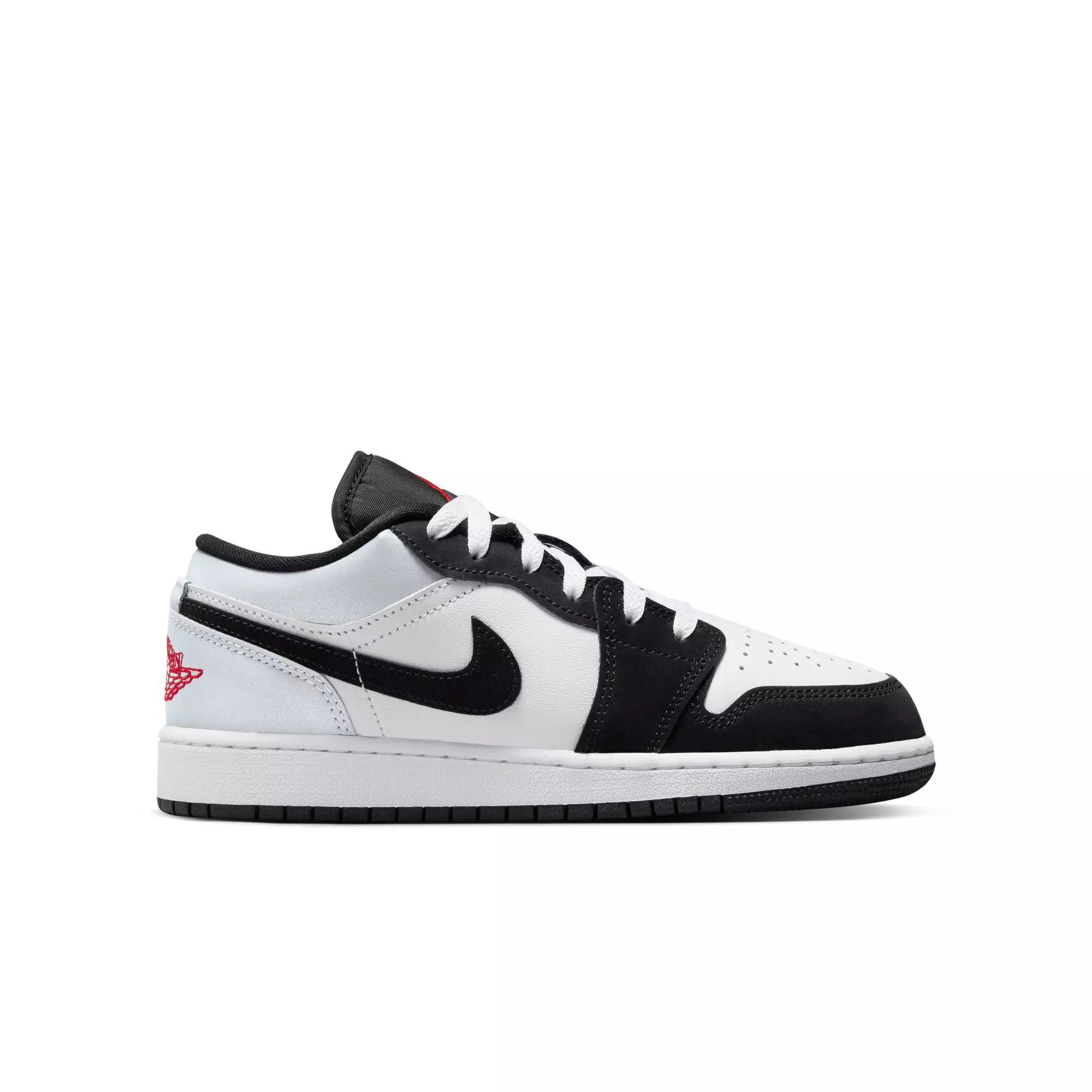 The Jordan 1 Low SE "White/Fire Red/Black/Matte Silver" Grade School Boys' Shoe features premium leather, a low-cut silhouette and classic color blocking. Its padded collar and cushioned insole deliver lasting support and comfort.