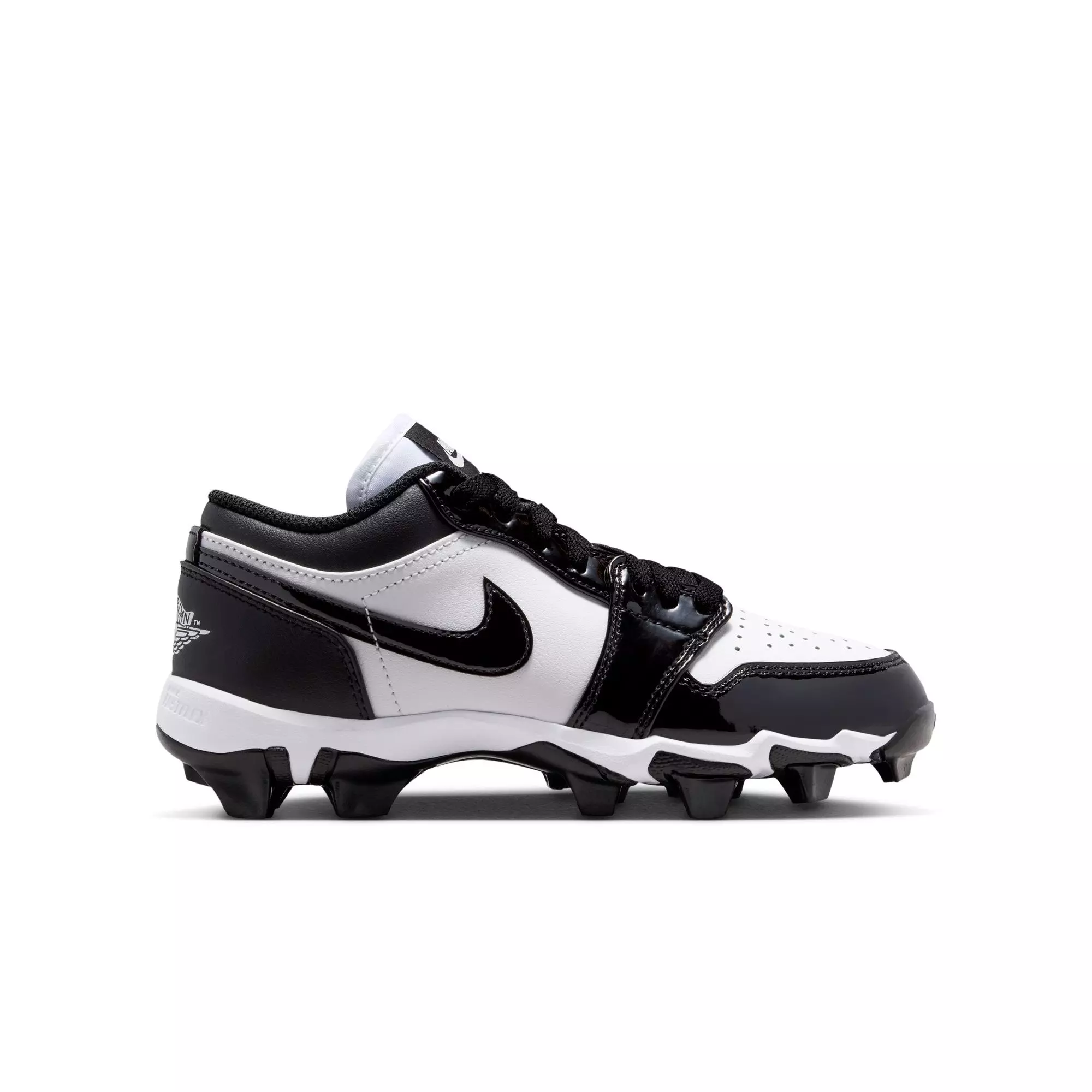 Built to play fast, the Jordan 1 Low "White/Black" Grade School Boys' Football Cleat helps young athletes cut and pivot with confidence. A wide stud layout supports quick direction changes, while external traction pods bite into turf for reliable grip.