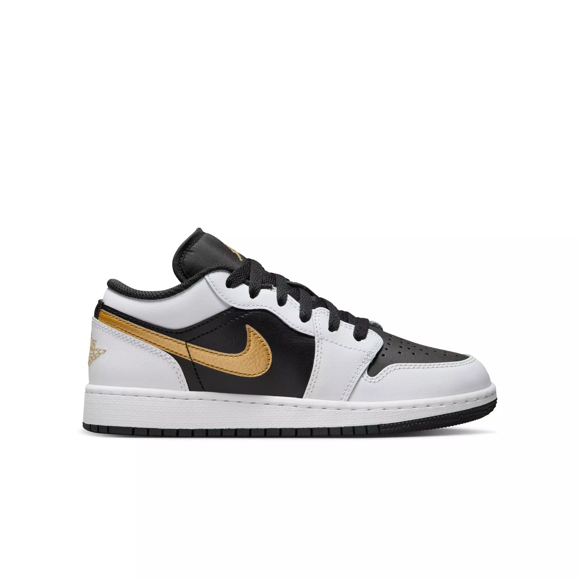 The Jordan 1 Low 'White/Metallic Gold/Black' Grade School Boys' Shoe blends classic sneaker heritage with modern updates. It features breathable mesh panels and supportive overlays that highlight its sporty silhouette.
