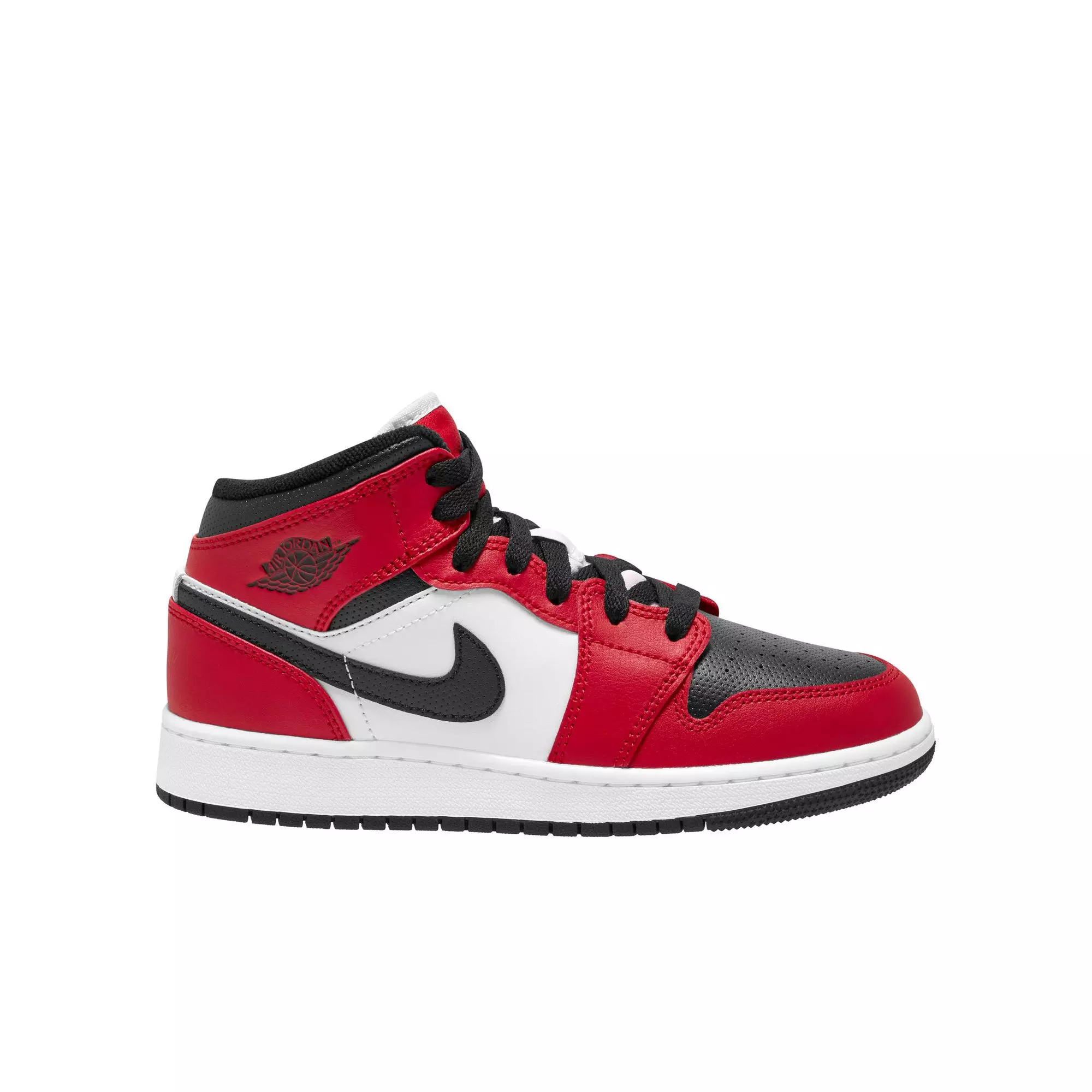 A FRESH LOOK FOR A STREET FASHION ICON.Follow in the footsteps of greatness. The all-time classic Jordan 1 Mid "Black/Gym Red" Grade School Boys' Shoe design gets a makeover with fresh pops of color and mixed materials.
